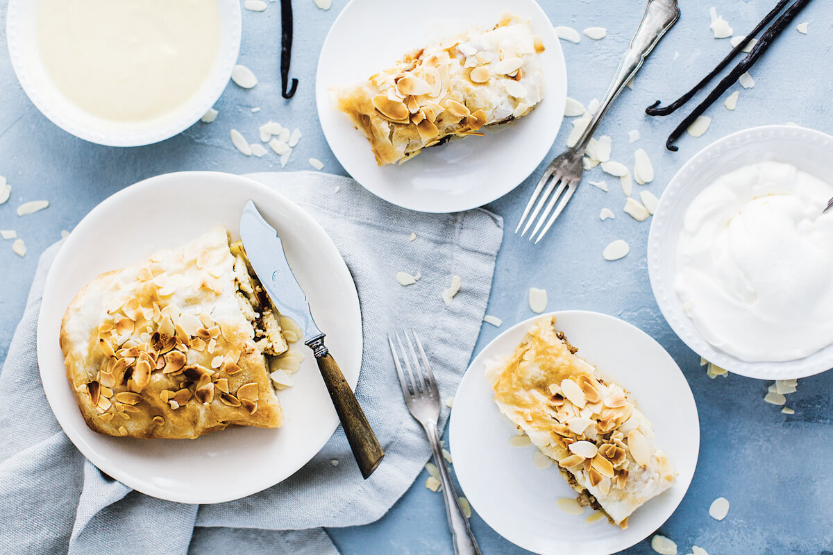 4. Den Strudel mit der restlichen Butter bestreichen und mit den gehobelten Mandeln bestreuen.