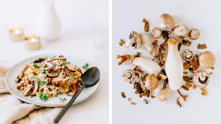 Zutaten für vier Personen 200 g Kräuterseitlinge oder Steinpilze 200 g Champignons 200 g Eierschwämmli 2 bis 3 Zwiebeln 2 Zehen Knoblauch 350 g Risottoreis 2 dl trockener Weisswein 8 dl Gemüsebouillon 20 g Butter 4 EL Olivenöl 4 bis 5 Zweige Thymian 4 bis 5 Zweige Peterli 100 g Parmesan, möglichst frisch gerieben Salz und Pfeffer Zubereitung Die Zwiebeln fein würfeln, frische Pilze putzen und in Scheiben…