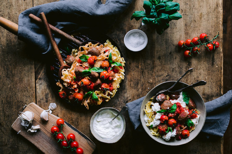 5. Tagliatelle zur Tomatensauce geben. Mit Cherrytomaten, Basilikum und Ricotta servieren.