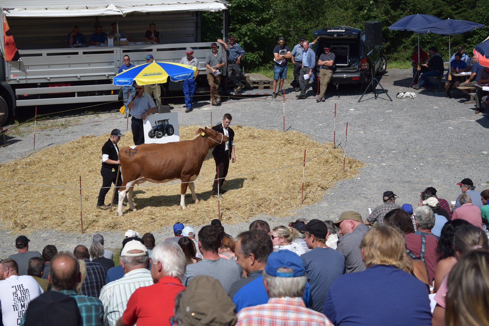 «Wir lassen diese Kuh noch ein paar Runden drehen, damit wir ihre Qualität bewundern können», verkündete Speaker und OK-Präsident Andreas Brügger während der Auktion mehrfach und Publikum wie auch Käufer honorierten die umsichtige Präsentation der Tiere. Bereits bei der Vorschau hat das OK ein gutes Auge für die Tiere bewiesen, die gesucht sind. Und die Viehzuchthochburg machte ihrem Namen alle Ehre, Brügger dankte den Züchterfamilien für die guten Tiere, die in hervorragender Kondition vorgestellt wurden. Bei den beiden teuersten Tieren spendete das Publikum sogar spontan Applaus. So wechselte die Kilian-Tochter Stefanie, die mit 26 kg Tagesmilch frisch gekalbt auf dem Platz stand für 7100 Franken den Besitzer. Sie kommt, wie auch einige weitere sehr qualitätige Tiere aus dem Stall von Martin Schäfer aus Weissenburg. Eine reine Simmentaler-Kuh mit enorm viel Ausdruck erreichte mit 6500.- Franken den zweithöchsten Preis des Tages. Die Alex-Tochter Doris wurde von Hans Wenger aus Zwischenflüh zum Verkauf angeboten.