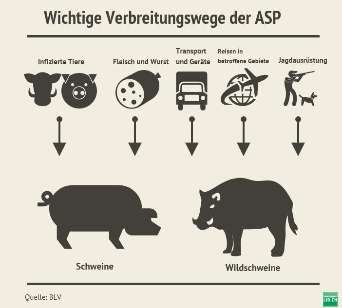 Tritt die ASP bei Hausschweinen auf, hilft nur das Töten von Beständen als Gegenmassnahme. Denn eine Impfung oder Behandlung existiert nicht. Keine Gefahr stellt die Krankheit hingegen für andere Tiere und Menschen dar. Weitere Informationen gibt es auf der Website des BLV.