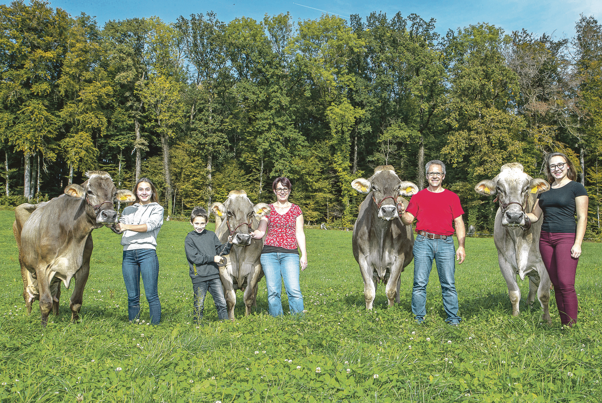Für viele Betriebe steht aber nur eines im Vordergrund: Wer nicht liefert, wird aussortiert. Dies ist nicht nur für den Betriebsleiter kostspielig, Kühe mit einer tiefen Nutzungsdauer belasten die Umwelt auch viel mehr als eine Kuh, die mehrere Laktationen abschliesst. Und bei Dürrenmatts? Ihr Ziel ist es, dass jede Kuh mindestens fünf Laktationen bei ihnen absolviert. Denn erst ab der vierten Laktation erreichen die Kühe aus ihrer Sicht die Höchstleistung. «Dank dieser Zuchtphilosophie sparen wir nicht nur Geld, sondern wir können dadurch auch viel mehr junge Kühe verkaufen», hält Beat Dürrenmatt fest. Nicht nur die Genetik und Vererbungskraft spiele dabei eine Rolle, viel wichtiger sei die Haltung und Pflege des Viehbestandes. «Neben viel frischer Luft im Stall ist es wichtig, dass man den Kühen Zeit lässt, auch dann, wenn sie nicht immer gleich wieder tragend werden», empfiehlt der Züchter, der seine 32 Kühe in einem Anbindestall hält. Und noch eines fällt dem Züchter auf: «Damit die Kühe die 100 000er-Grenze erreichen, müssen sie robust sein. Meistens sind es die Kühe, die zuvorderst mit der ‹Zügeltreichel› an die Viehschau laufen», beobachtete er. Und Dürrenmatts müssen es ja wissen: Neben den achtzehn 100 000er-Kühen in ihrem Stall durften sie schon 23 Zuchtfamilien präsentieren.