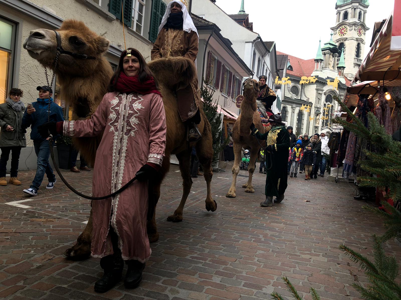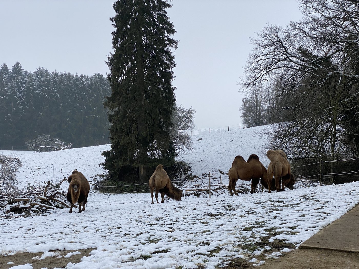 Kamele im Schnee – ein etwas ungewöhnliches Bild, aber dennoch keine Fata Morgana. An der Grenze zu St. Gallen und unweit vom Bodensee kauen Cleo, Hathia und Shakira gemächlich an den grünen Halmen, die von der weissen Pracht noch nicht vollends bedeckt wurden. Neugierig blicken sie auf, als die Redakteurin die Einfahrt zum Kamelhof Olmerswil in Neukirch an der Thur TG hochfährt. Karin Stiffler wartet bereits am…