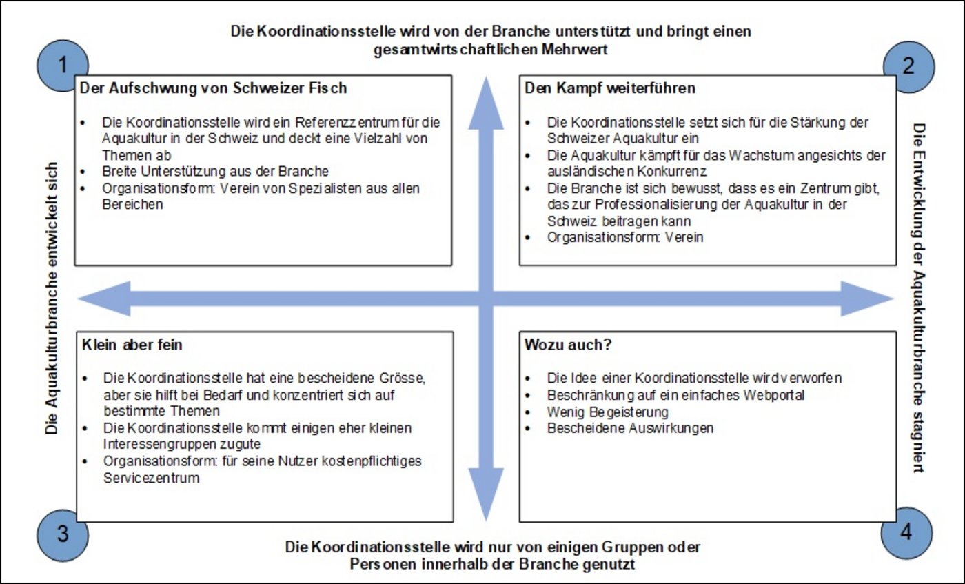 Die HAFL und die ZHAW haben in einer Studie die heutige Situation der Aquakulturbranche erfasst. Dafür wurden die aus den ersten Untersuchungen gesammelten Informationen analysiert, um die Herausforderungen in der Branche zu ermitteln und die Aufgaben der zukünftigen Koordinationsstelle zu erkennen und zu priorisieren. Zusätzlich werden in der Studie verschiedene Szenarien dargestellt, wie sich die Koordinationsstelle langfristig entwickeln könnte. Die Studie schliesst dann mit einem Entwurf der nächsten Schritte und einem Vorschlag für deren Finanzierung ab.
