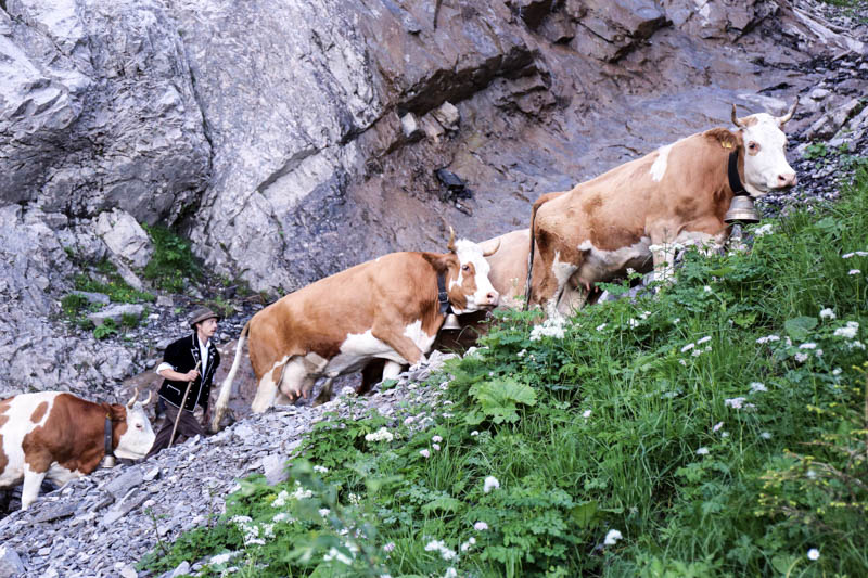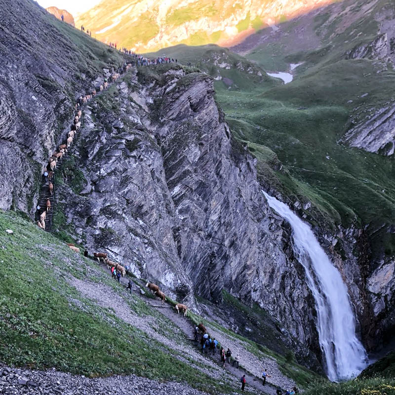 Die erfahrenen Sennen trieben am frühen Morgen des 23. Juni 2018 nach und nach ihre Tiere zusammen und stiegen den schmalen Fels Pfad zur Alp empor. Der steile Weg schlängelt sich von der Talstation «Unter dem Birg» bis auf das Hochplateau der Engstligenalp.