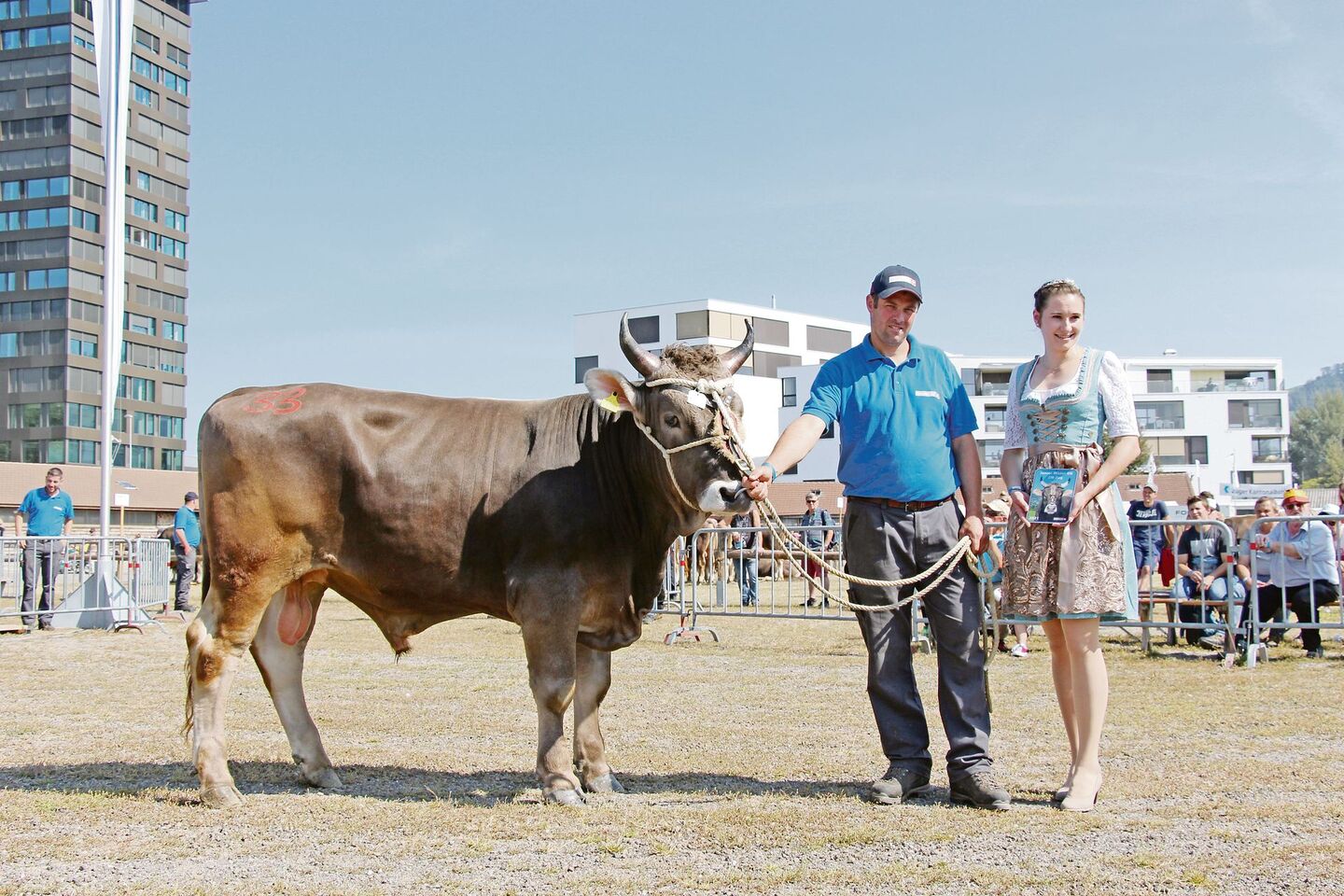 Zum Schluss wurde verkündet, dass 34 der am Zuchtstiermarkt Zug aufgeführten Stiere je eine Bronzemedaille und drei Stiere eine Silbermedaille gewonnen hätten. Gar drei Goldmedaillen gewann Eugen Hitz aus Trimbach im Kanton Solothurn für seinen Stier Gregi. Dieser OB-Stier ist schon allein mit seinem Gewicht von 1375 Kilogramm beeindruckend.