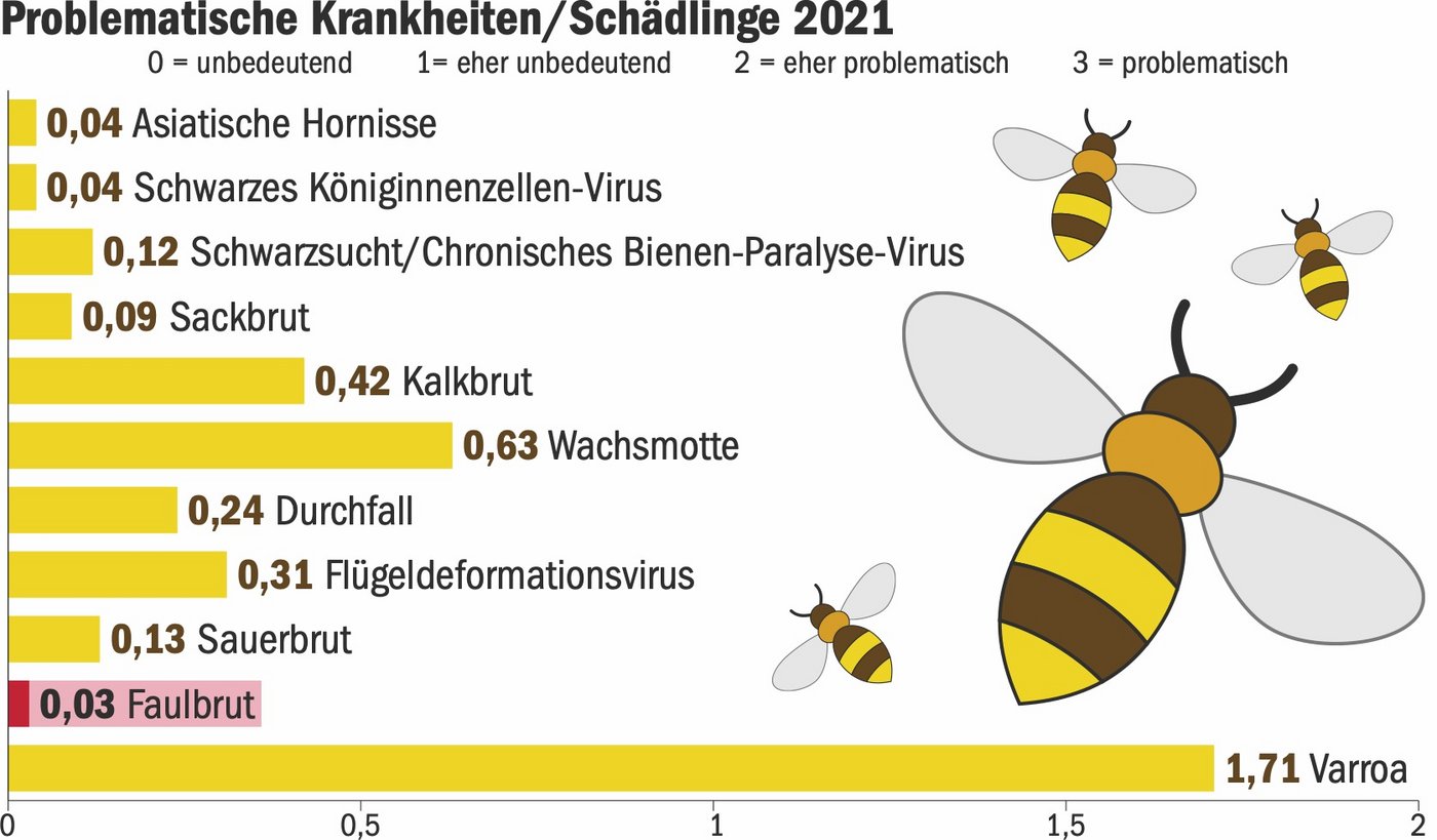 Im Dezember 2021 und Januar 2022 hatte der BGD eine Umfrage bei den Imker(innen) durchgeführt. Mittels Fragebogen sollte die Gesundheit der Honigbienenvölker beurteilt werden. Wie 2020 wird die Varroamilbe als «am ehesten problematisch» beurteilt und liegt mit grossem Abstand an der Spitze. An zweiter Stelle gaben die Befragten die Wachsmotte an. Witterungsbedingt war die Kalkbrut 2021 problematischer als in früheren Jahren. Die Problematik Faulbrut wurde in der Deutschschweiz fälschlicherweise nicht abgefragt (rot gekennzeichnet). Da aber nur wenige Fälle auftraten, habe dies gemäss BGD keine Bedeutung.