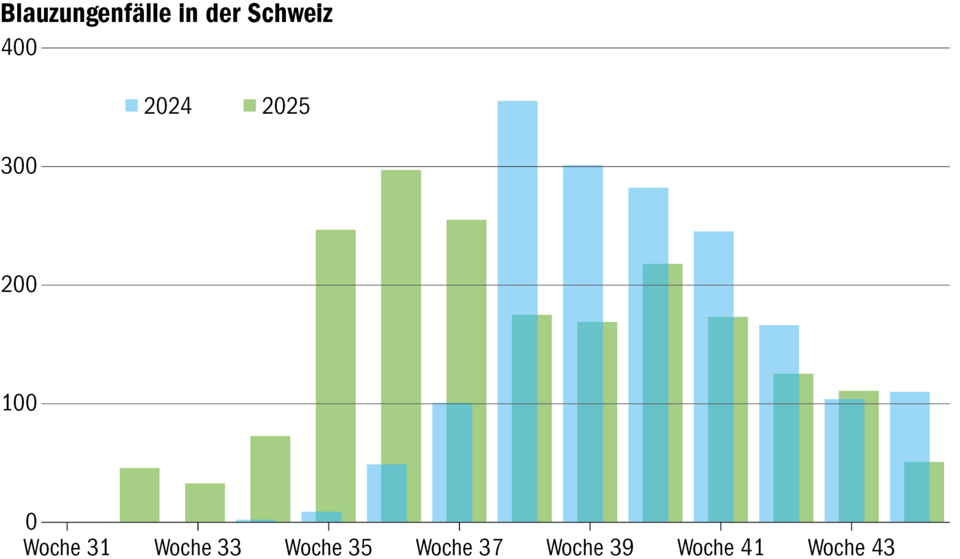 Um die Blauzungenkrankheit (BTV) ist es in der Schweiz seit einigen Wochen wieder etwas ruhiger geworden. Mit dem Eintreten der kalten Tage geht nun bereits die zweite «Saison» der Seuche in der Schweiz vorüber. Während 2024 hauptsächlich der Norden – von West bis Ost – unter der Seuche ächzte, und das noch ohne Impfung, rutschte der Gürtel 2025 südwärts. Insbesondere der Kanton Bern war heuer stark betroffen. Was sich aus den Zahlen ebenfalls zeigt: Die Fälle traten verglichen mit 2024 etwas früher auf. Sicherlich hat das auch damit zu tun, dass man sich in diesem Jahr bewusst war, dass es Blauzunge gibt.