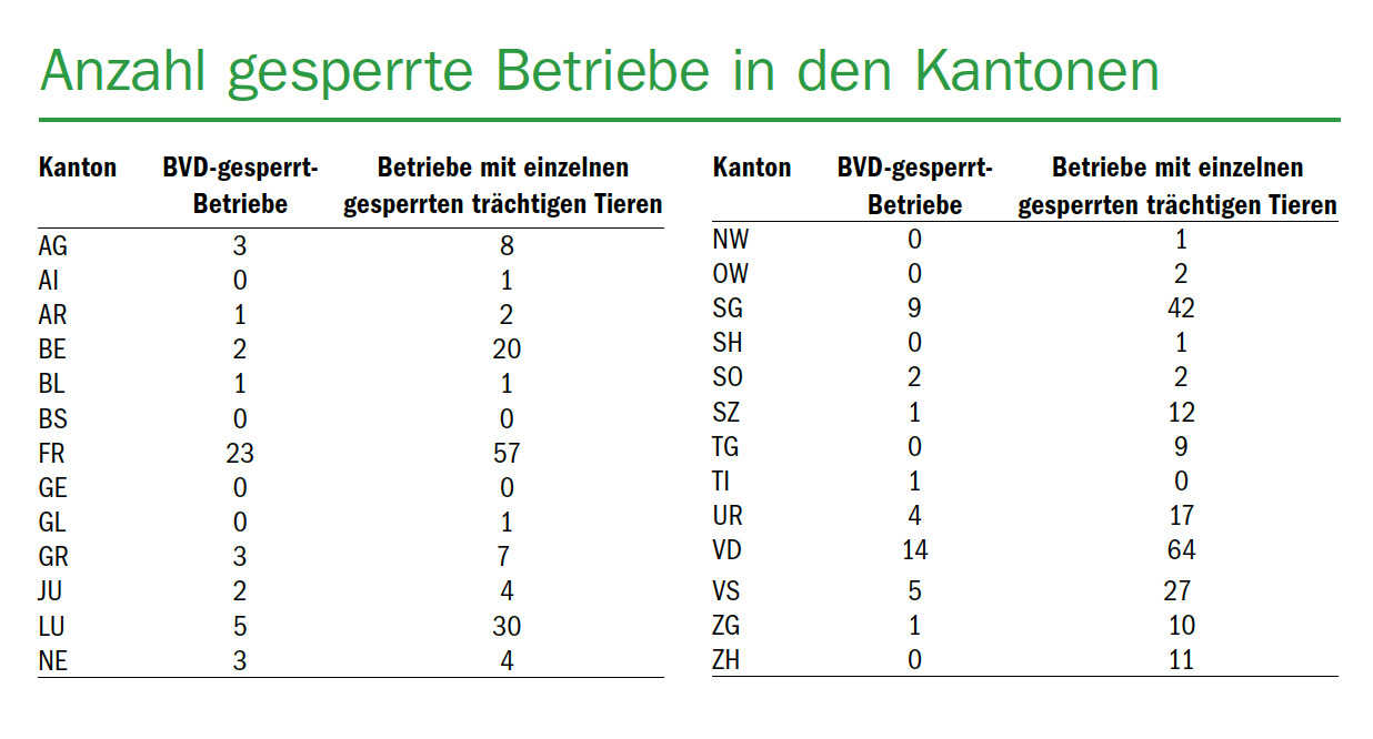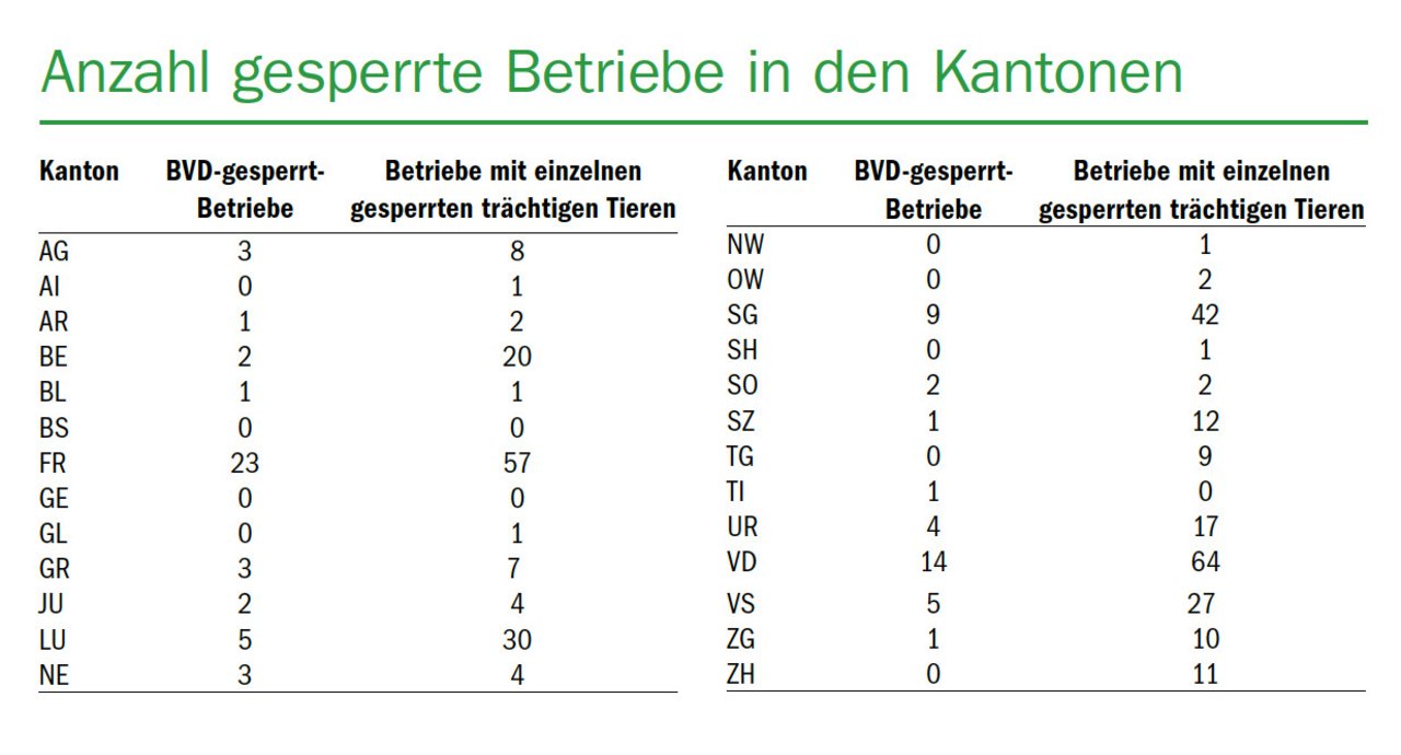 Obwohl der verstärkte Kampf gegen die auszurottende Tierseuche Bovine Virus Diarrhoe (BVD) Fortschritte zeigt, sind aktuell für das laufende Jahr 96 Seuchenfälle registriert, wie Stefan Kunfermann, Mediensprecher vom Bundesamt für Lebensmittelsicherheit und Veterinärwesen BLV auf Anfrage mitteilt. Einzelne Kantone sind frei Gesamtschweizerisch seien noch rund 280 Tierhaltungen von den BVD-Massnahmen betroffen.…