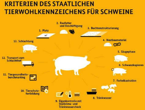 Betriebe, die das Kennzeichen einsetzen, müssen höhere Tierschutzanforderungen erfüllen, die über dem gesetzlichen Mindeststandard liegen. Dazu gehören etwa: Mehr Platz für die Tiere im Stall, mehr Beschäftigung und Raufutter. Detaillierte Bestimmungen finden sich auf bmel.de