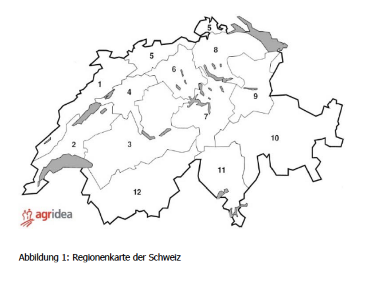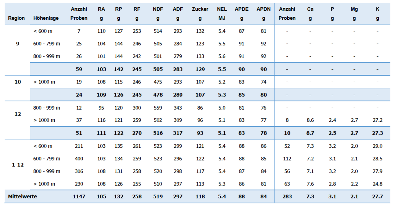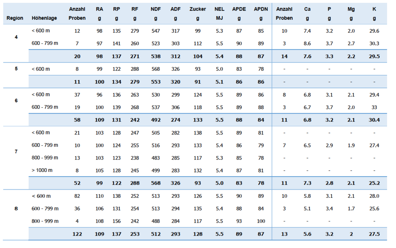 Die Gehalte in den verschieden Futterbauregionen sind sich in diesem Jahr sehr ähnlich. Etliche Regionen hatten Schwierigkeiten den Rohaschegehalt und somit die Futterverschmutzung unter 100 g/kg TS zu halten. Die Werte aus der Region 5 sind nicht vergleichbar, da lediglich 11 Proben zur Verfügung standen.