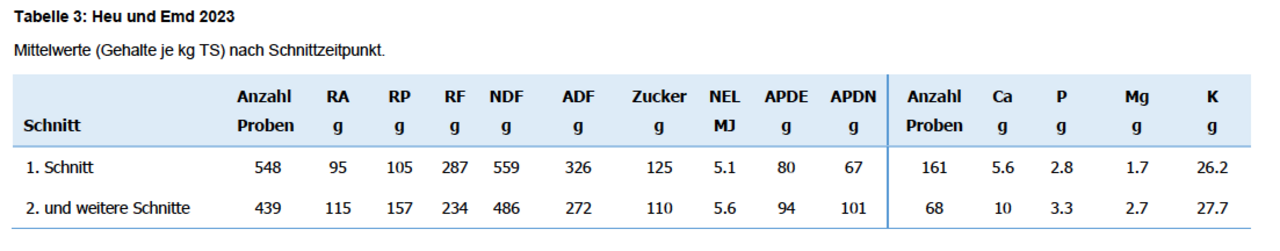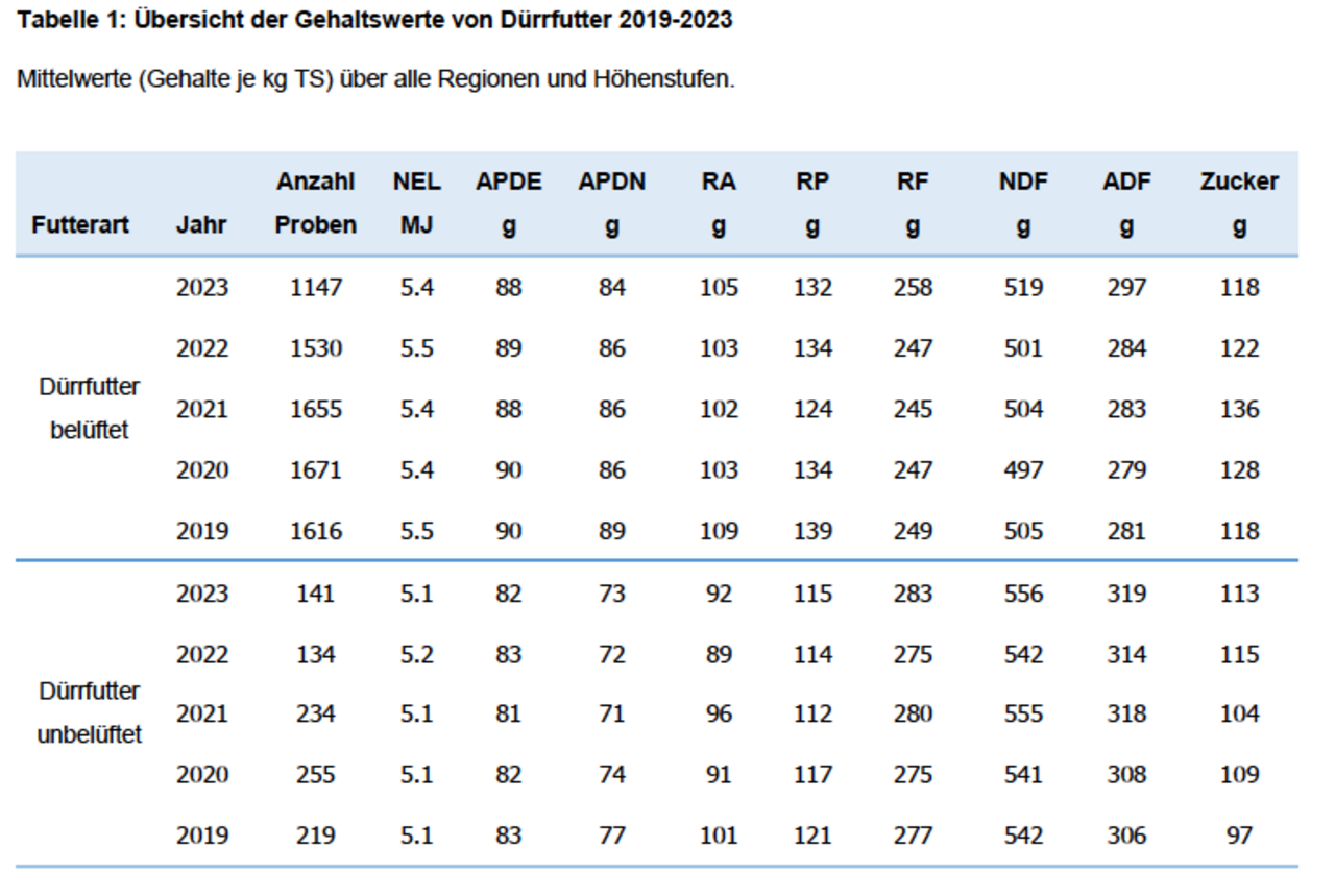 Die Analysegehalte des Dürrfutters 2023 liegen im Durchschnitt der letzten fünf Jahre. Sowohl der mittlere Energiegehalt von belüftetem Dürrfutter mit 5.4 MJ NEL pro kg Trockensubstanz (TS), als auch jener von bodengetrocknetem Dürrfutter mit 5.1 MJ NEL pro kg TS entspricht den Werten der Jahre 2021 und 2020. Die APDE- und APDN-Gehalte sind mässig (88 bzw. 84 g/kg TS für belüftetes und 82 bzw. 73 g/kg TS für unbelüftetes Dürrfutter) und liegen deutlich unter den Zielwerten. Die Rohfasergehalte von unbelüftetem Dürrfutter (283 g/kg TS) sind leicht höher als jene von belüftetem Dürrfutter 258 g/kg TS), der Zuckergehalt ist wie erwartet tiefer (113 g/kg TS für unbelüftetes bzw. 118 g/kg TS für belüftetes Dürrfutter). Beides spricht dafür, dass die Vorteile der Heubelüftung in diesem Jahr nur wenig zum Tragen kamen.