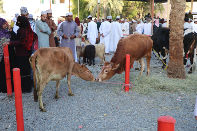 Männer in den typischen langen weissen Gewändern, Dishdasha genannt, laufen mit ihren Tieren, die sie an Stricken führen, um einen Betonsockel herum und feilschen heftig mit den Kaufwilligen. Auch viele Frauen, meist mit Vollverschleierung, bieten ihre Tiere an und verhandeln lautstark. Die erklärte Gleichstellung mit den Männern findet im Oman nicht nur auf dem Papier statt.