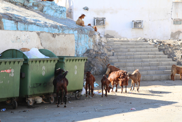 Doch auch dort, wo es mehr nach Mondlandschaft als nach fruchtbarem Land aussieht, lassen sich überall kleinere Ziegenherden beobachten. In den Dörfern sind sie häufig in der Nähe der Mülltonnen zu finden. Dort fressen sie in aller Ruhe verwertbare Resten, aber auch Müll und ruhen sich anschliessend im Schatten der Tonnen und Autos aus.
