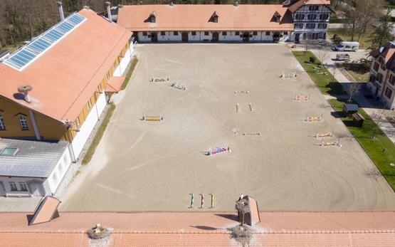 Mit Blick auf den Reitplatz zieren mehrere Horste die Dächer des Nationalgestüts.