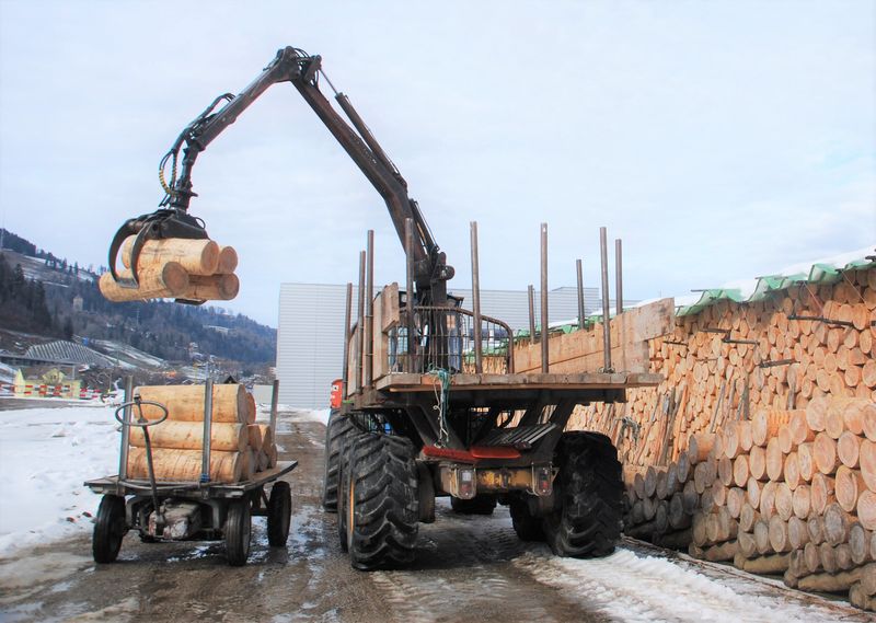 Auf dem Betrieb der Firma Lindner Suisse ist an diesem winterlichen Nachmittag schneebedingt wenig los. Draussen werden Holzruggel mit starken Greifarmen auf Forstmaschinen auf exakte Beigen geschichtet. Die Stämme sind bereits geschält. Sie wurden vor kurzem in der Region gefällt, werden in Wattwil entrindet und in Meterstücke geschnitten. Sie lagern für 18 Monate bis zur Weiterverarbeitung.