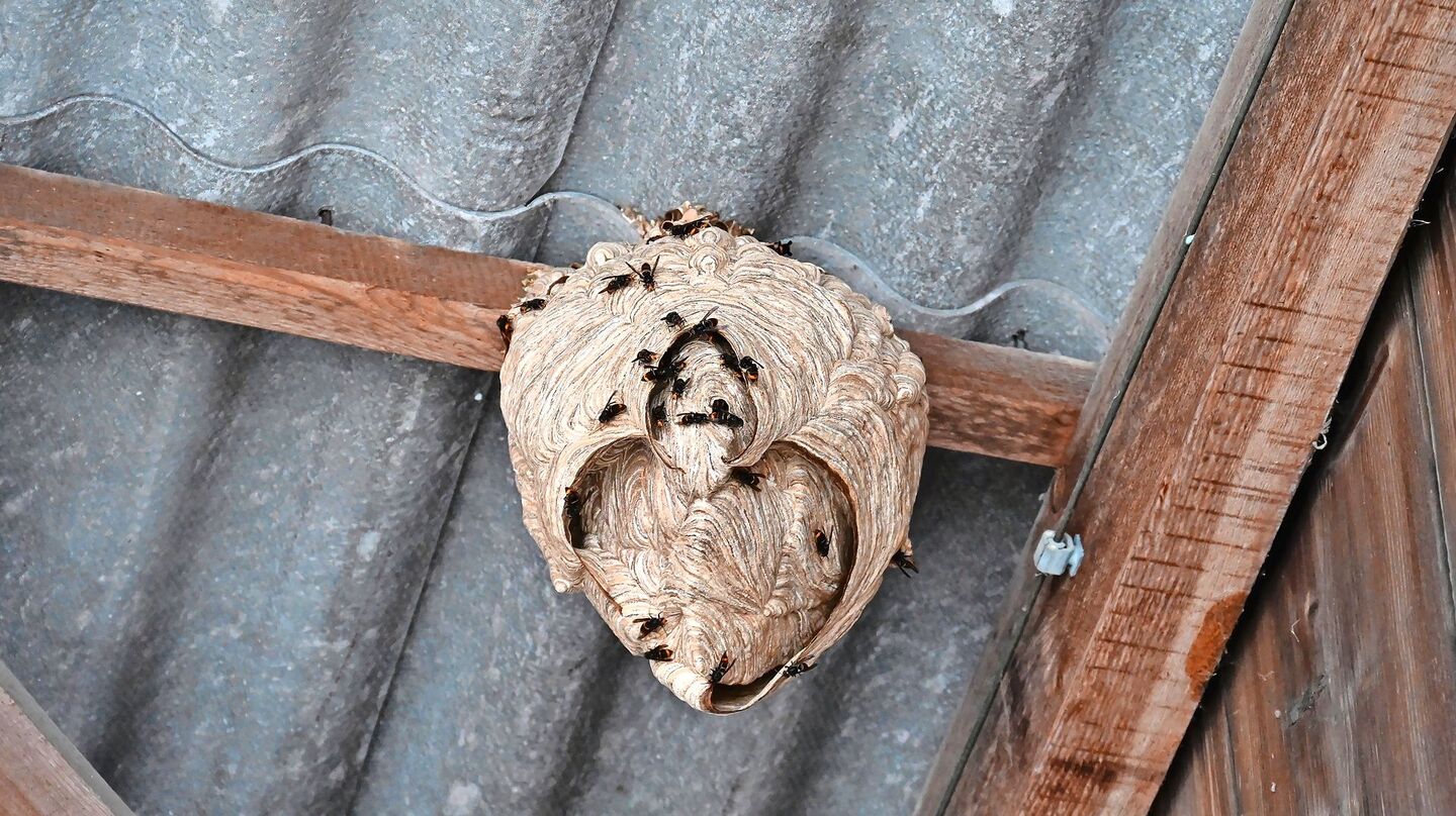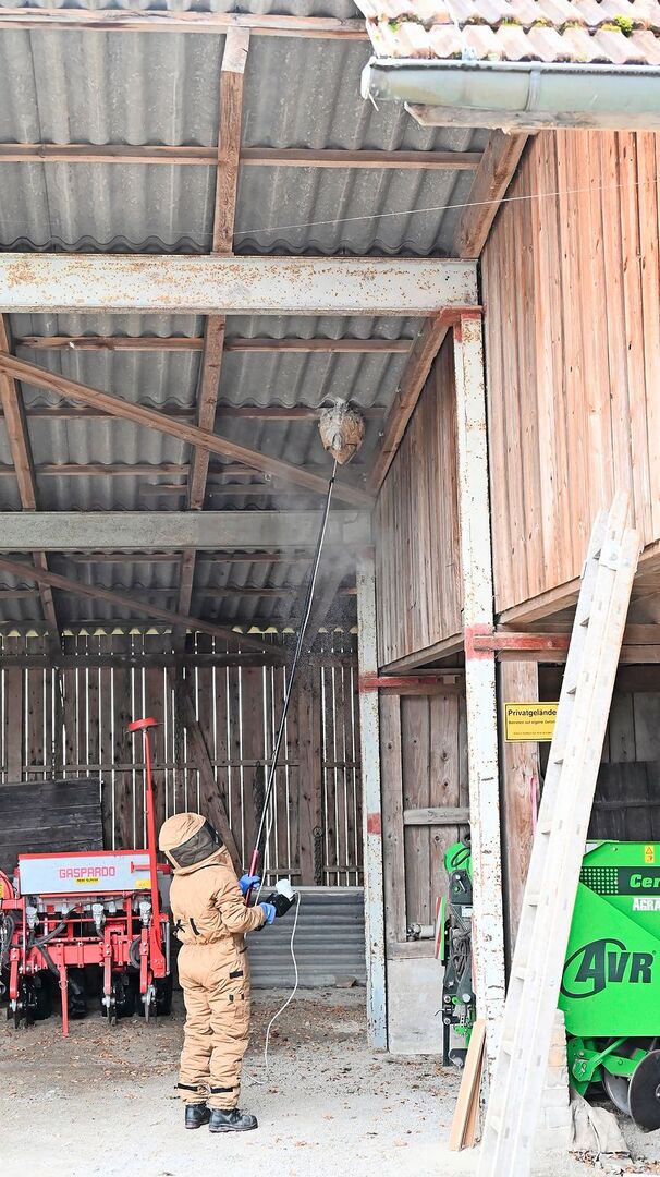Schädlingsbekämpfer Josua Sommer von der Kammerjägerei Kam-So GmbH in Worben BE sieht in seiner Schutzmontur aus wie ein Astronaut auf dem Mond. Er macht sich bereit, um im bernischen Epsach im Schopf von Hans Helbling ein Nest Asiatischer Hornissen zu beseitigen. Für diese Bekämpfung reicht ein normaler Schutzanzug, wie ihn Imker tragen, nicht. Denn der Stachel der Asiatischen Hornissen sei mit sechs Millimetern…