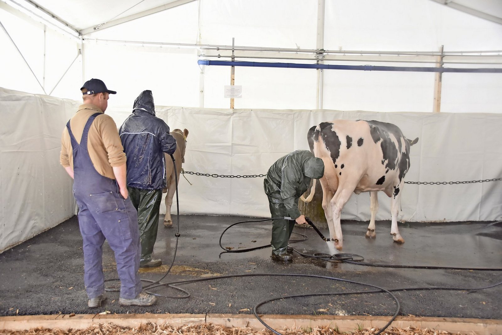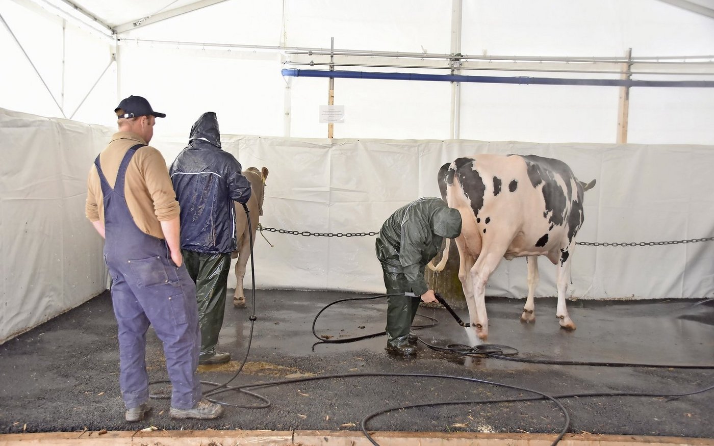 Bevor es an ihren Platz ins Zelt geht, wird draussen noch jede Kuh fein säuberlich gewaschen. Angereist aus Dieterswil ist auch Thomas Rutsch mit seiner eindrücklichen Kuh Apple-Crisp Sira. «Es ist schon eine Ehre, wenn wir mit einer Kuh an die BEA dürfen», sagt Rutsch.