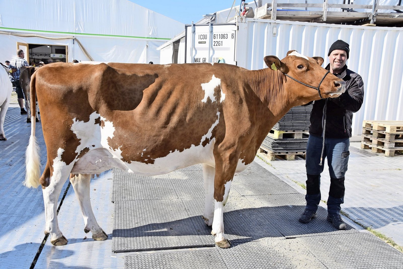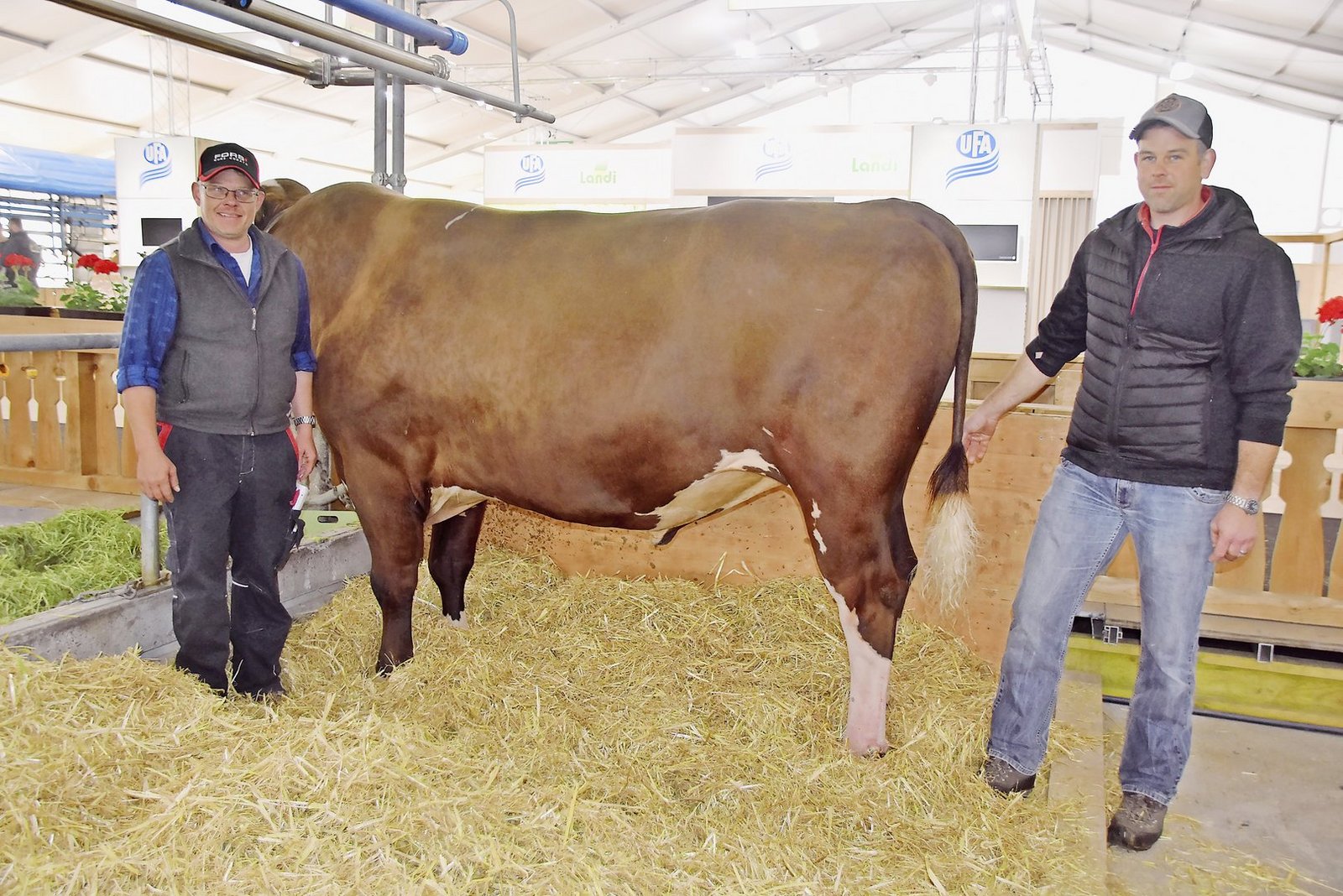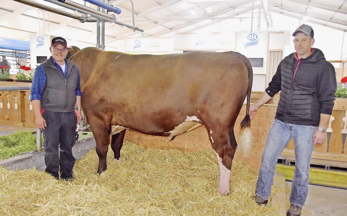 «Ich hoffe, dass sie an der BEA jetzt gut frisst und nicht Heimweh hat», meint die Züchterin. Für Wyss ist es nicht nur eine Ehre, sondern auch eine grosse Freude, dass ihre Kuh für die Dauerausstellung auserkoren wurde. Mit einem Stier anwesend sind Simon Eichenberger aus Arni und Hans-Jörg Schäfer aus Bowil. Mitgebracht haben sie niemand Geringeres als Schwarzbach Madison Hannover (55 96).
