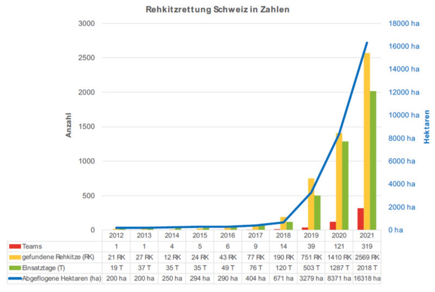Die Rehkitzrettung Schweiz blicke auf eine sehr erfolgreiche Rehkitzrettungs-Saison 2021 zurück, schreibt der Verein in einer Mitteilung. Über 300 Rettungsteams konnten 2569 Rehkitze auffinden und retten. Mit der Digitalisierung der Lüfte ist die Rehkitzrettung in den letzten Jahren auch um ein Vielfaches effektiver geworden und entwickelt sich rasant: Unter anderem hat sich das Verhältnis zwischen Einsatztagen und gefundenen Rehkitzen massiv verbessert und auch die abgeflogene Fläche hat sich im Vergleich zum letzten Jahr verdoppelt.