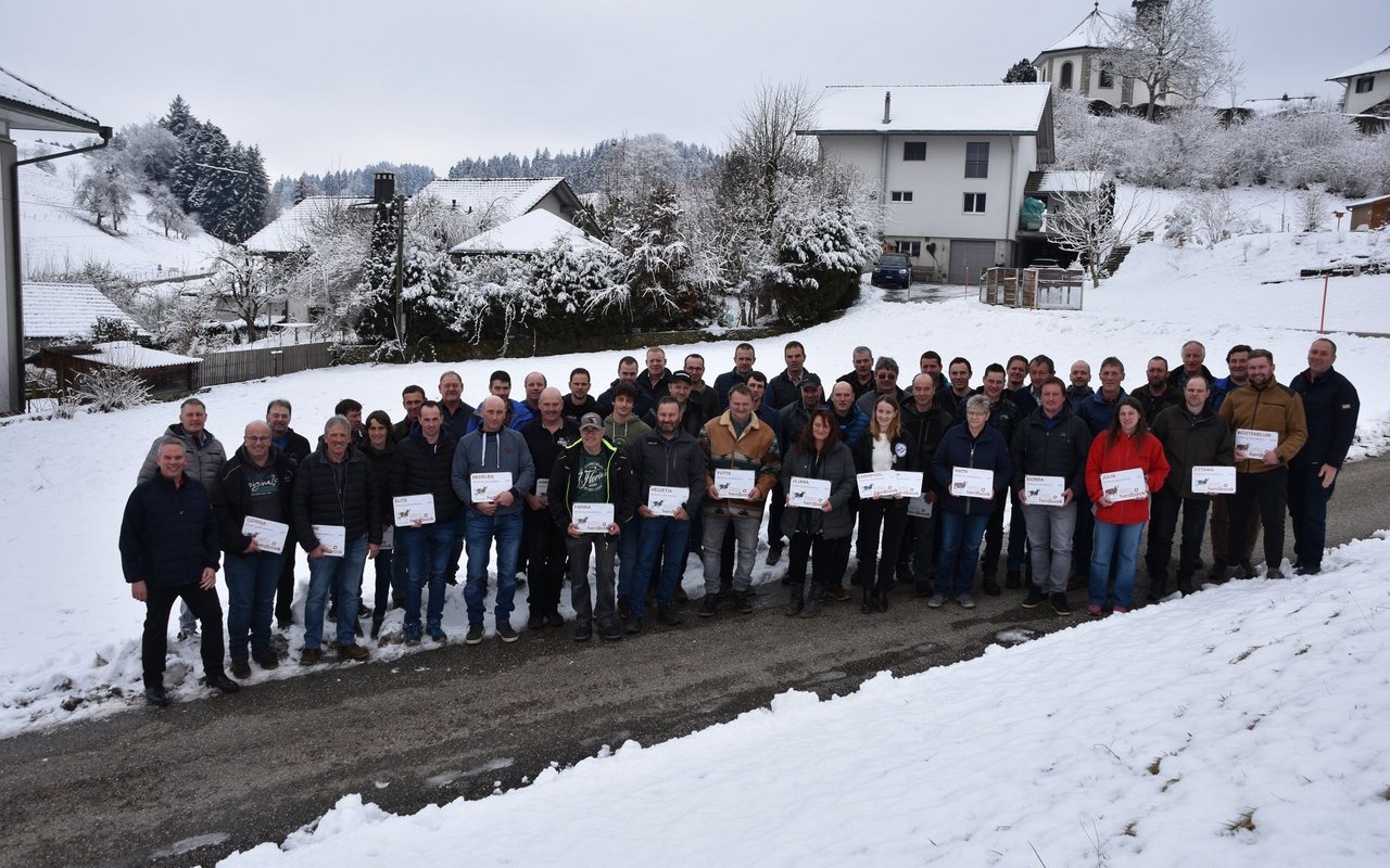 Ruedi Sommer, Präsident des Emmentalischen Fleckviehzuchtverbands, wies in seinem Jahresrückblick auf die vielen Schauerfolge seiner Mitglieder hin. Mit der Starparade vom Freitag, 21. Februar (abends mit den Jungzüchtern) und am Sonntag, 23. Februar (mit den Kühen) steht schon bald ein nächster Höhepunkt an. Dieses Jahr am 6. September findet zudem in Schüpbach auch die Emmentalische Verbandsschau wieder statt. Dass das Emmental ein starkes Zuchtgebiet ist, zeigt sich nicht nur an den zwei Auktionen in Burgdorf und in Schüpbach, sondern auch an den vielen 100'000er-Kühen die jedes Jahr an der DV geehrt werden können. Dieses Jahr waren es deren 52 Kühe mit ihren Züchterinnen und Züchter, die von Swissherdbook-Präsidenten Markus Gerber und dessen Direktor Michel Geinoz einen Plakette überreicht bekamen.