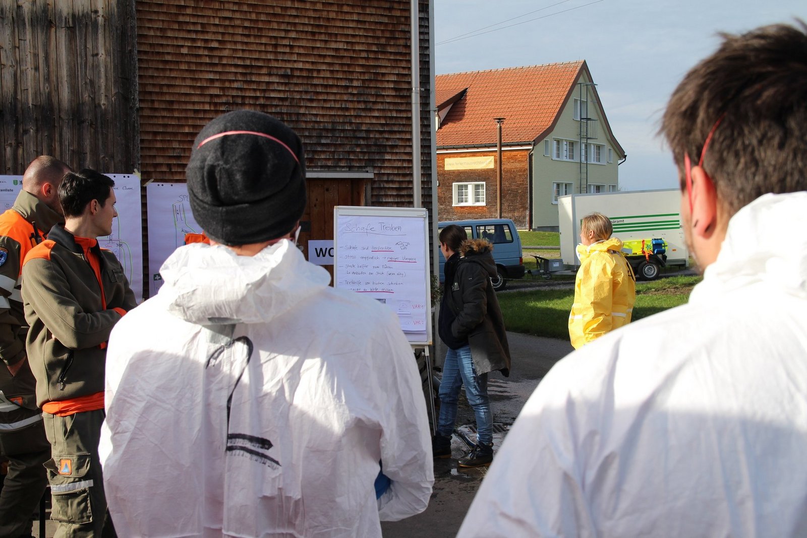 Beim diesjährigen Wiederholungskurs wurde die Zusammenarbeit zwischen den amtlichen Tierärztinnen und der Tierseuchengruppe auf zwei Schafhaltungen in Appenzell Ausserrhoden intensiv beübt. Dabei wurde der zeitliche Ablauf so realitätsnahm wie möglich gestaltet. «Anstelle der Keulung wurden die Mitglieder der Tierseuchengruppe zum schonenden Umgang mit den Schafen geschult. Tiere wurden keine getötet.»