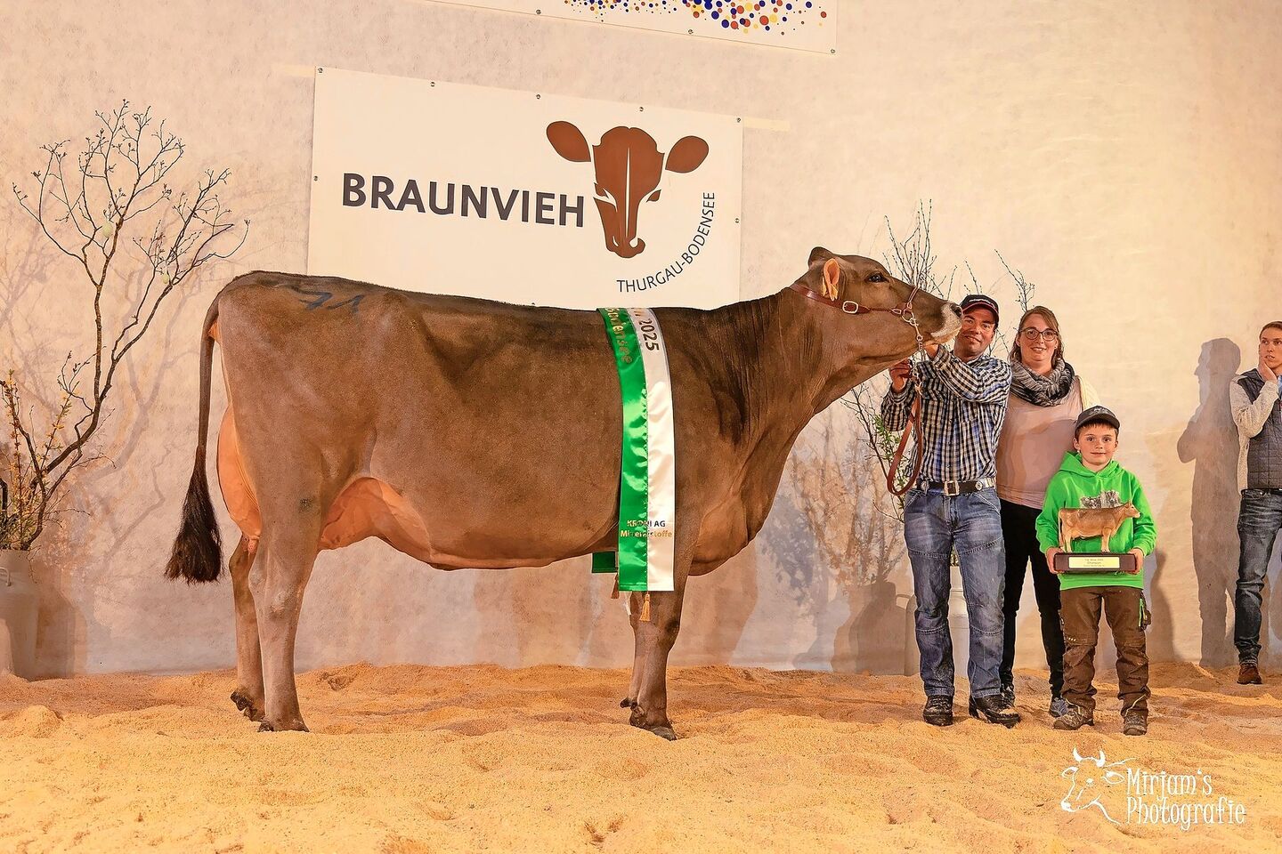 Unter Jubelrufen im Saal kürte Andreas Walser die Grand Champion. Der Titel ging an Dixi von Beat Lenzlinger aus dem thurgauischen Au. Sie war die Siegerin der Abteilung 7 – Kühe in der zweiten und dritten Laktation. Walser lobte Dixi als eindrückliche Kuh, stark im Rahmen, extrem schön gebaut, mit einem langen und breiten Becken sowie einem hoch angesetzten, breiten Euter mit einem starken Zentralband.