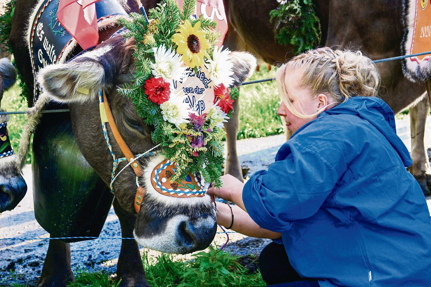 In Reih und Glied stehendie Kühe angebunden vor der Alphütte im bernischen Gental. Nach und nach ziehen die Bauern und Älpler ihnen Treicheln und Schmuck an. Der grosse Tag, die Alpabfahrt fand am vergangenen Samstag statt. Die Alp liegt an der Strasse von Innertkirchen Richtung Engstlensee.