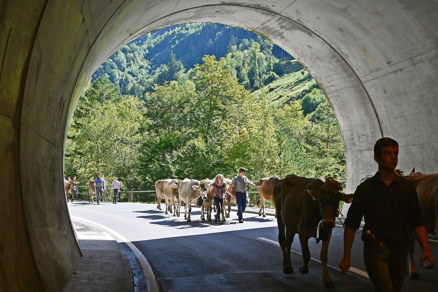 Etwa die Hälfte der Kühe bleibt im Dorf in einer Weide. Die restlichen Tiere müssen aber noch weiter laufen bis ins Urbachtal, wo sie auf eine Gemeinschaftsweide kommen. Insgesamt sind die Tiere mit den Zügelhelfern in etwa drei Stunden rund 13 Kilo-meter gelaufen. Was für eine Leistung!