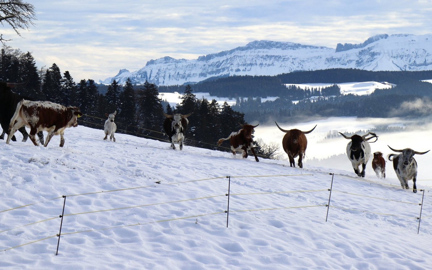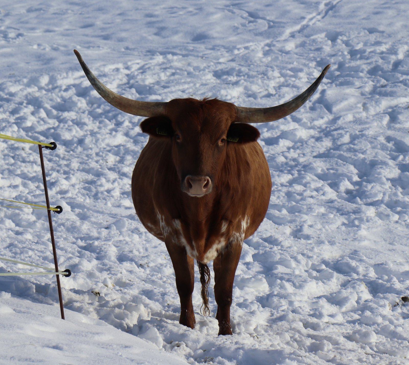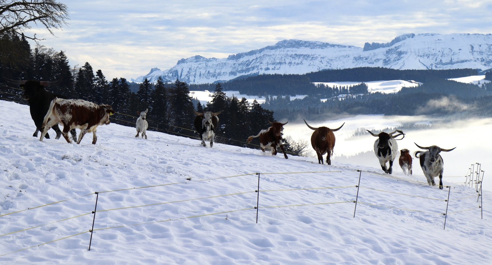 Der Schnee und das wunderschöne neugebaute Emmentaler Bauerhaus auf dem Möschberg im Oberthal ob Grosshöchstetten im Emmental erinnern nicht im Entferntesten an den amerikanischen Traum des Wilden Westens. Was im Stall steht allerdings schon: 17 verschieden gezeichnete langhornige Prärierinder – Texas Longhorns.