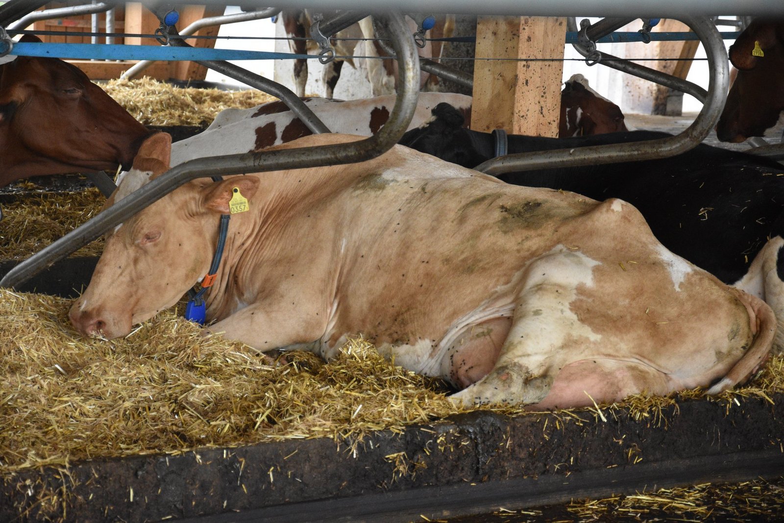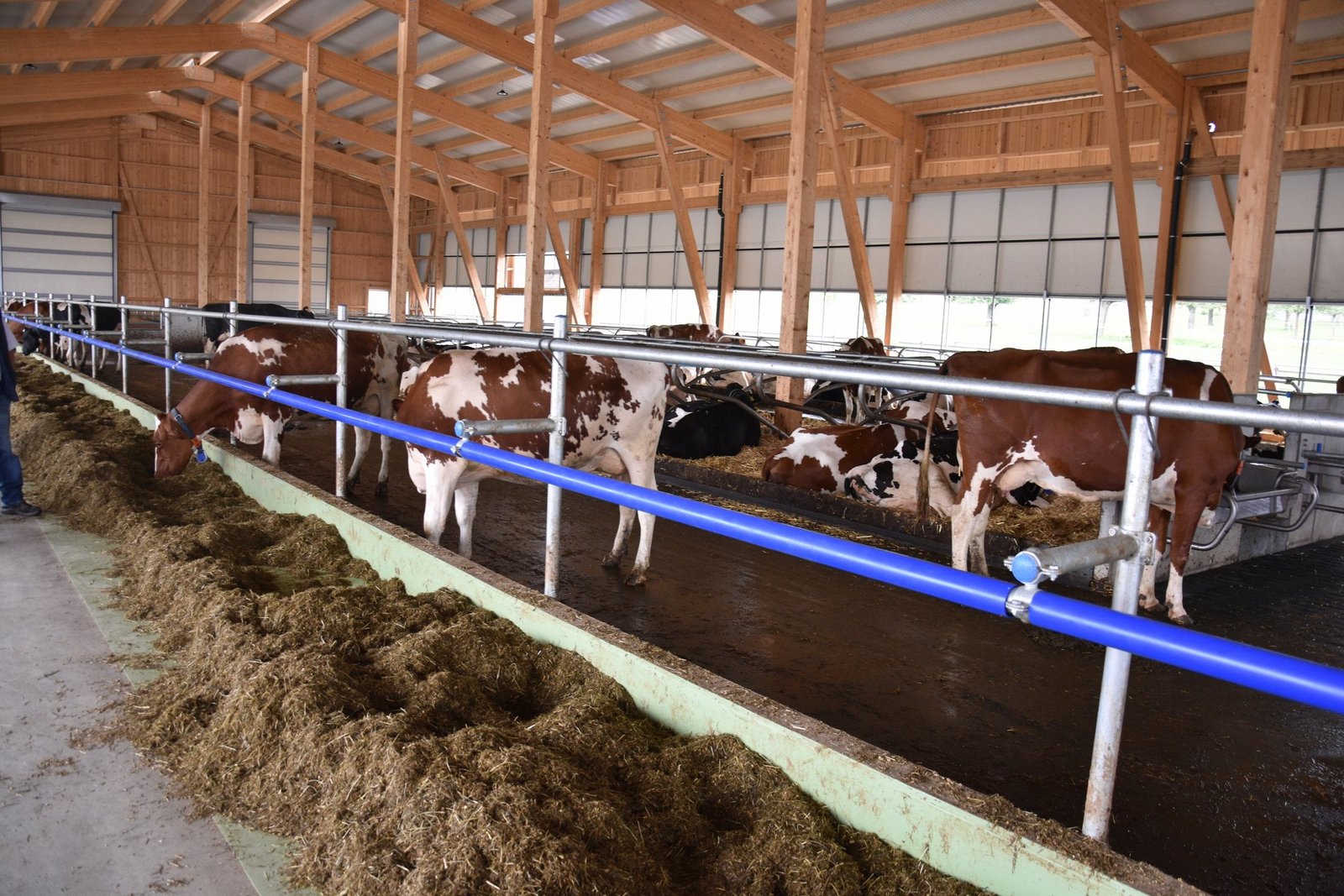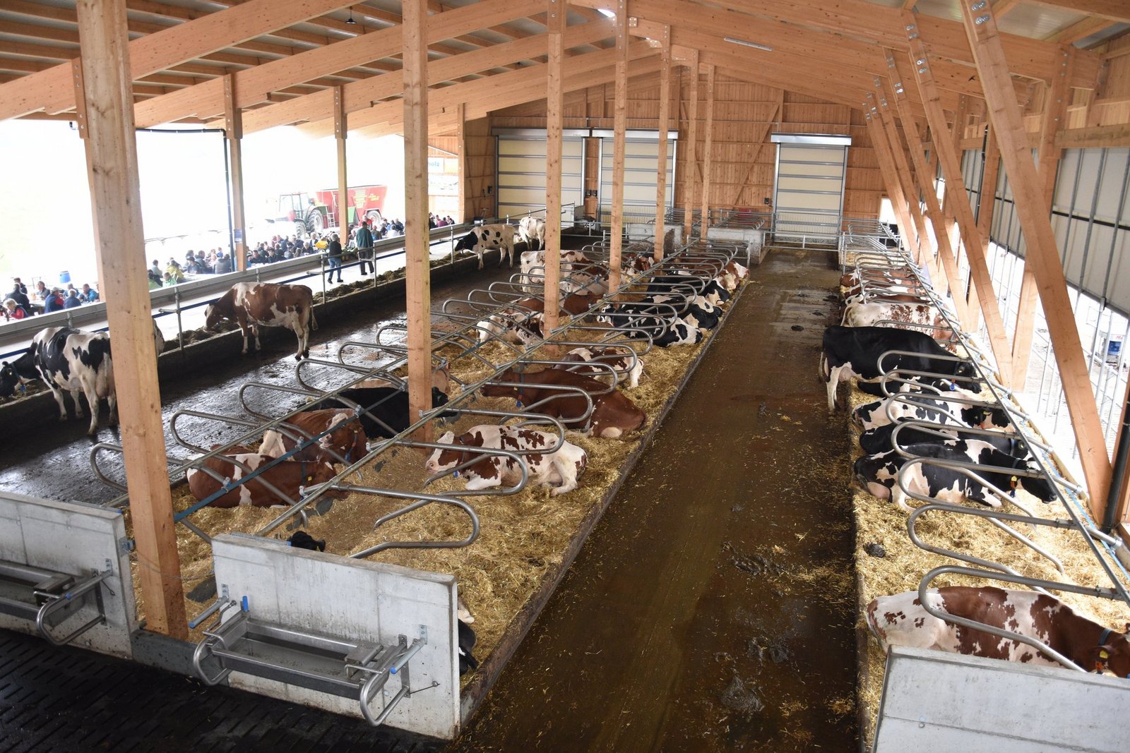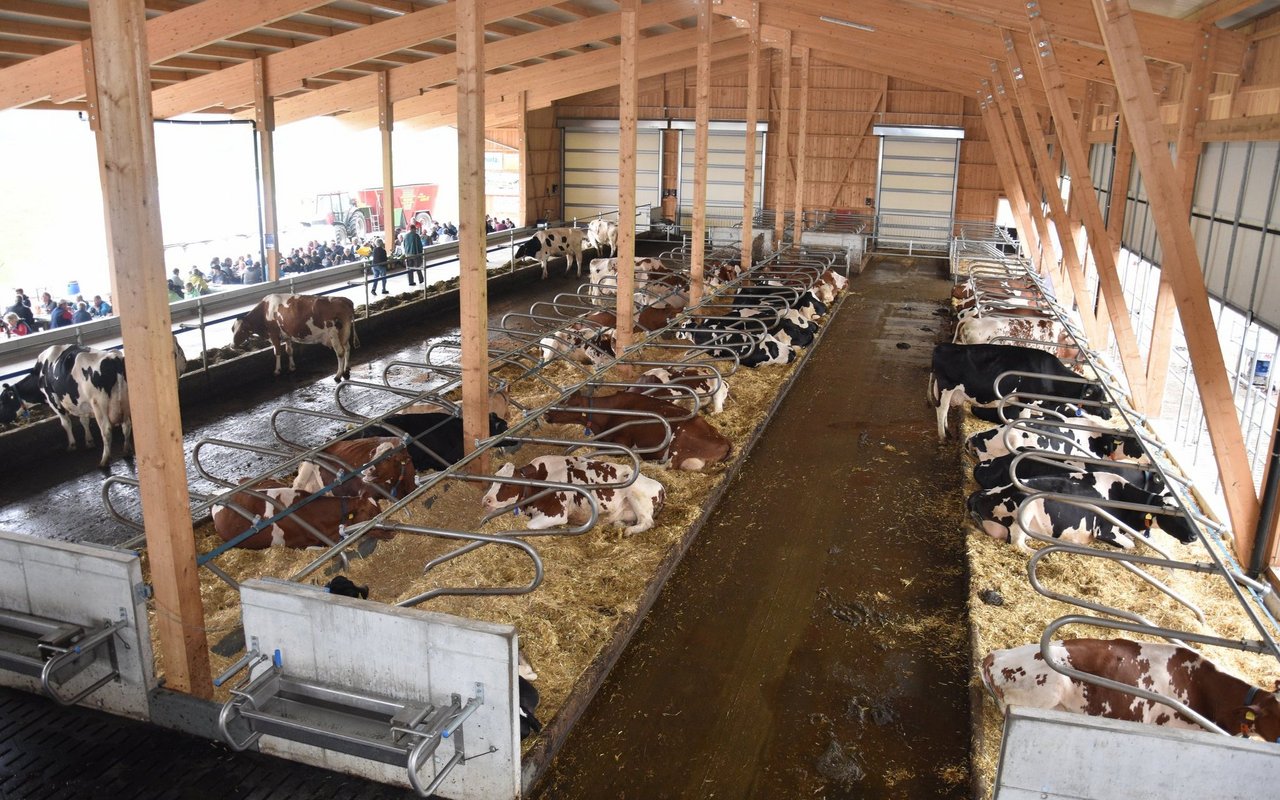 Obwohl der Stall mit 75 Liegboxen, noch nicht ganz ausgelastet ist, fühlen sich die 45 Kühe darin «sauwohl». Der Stall zeichnet sich aus durch viel Platz, viel Licht und viel frische Luft. Auch dem Tierwohl wurde grosse Beachtung geschenkt. Die Liegeboxen sind so ausgerüstet, dass die Kühe vorne am Kopf, viel mehr Bewegungsfreiheit haben. Auch die neuen Liegeboxenbügeln, sorgen für ein leichteres Aufstehen. Alle Kühe haben den Umzug vom Anbinde- in den Laufstall ohne Probleme überstanden. Keine einzige Kuh musste deswegen den Betrieb verlassen. Sogar die älteste, ein 14-jährige Kuh, fühlt sich im neuen Stall wie eine Zweijährige. Wer den neuen Stall bei Haslebachers noch sehen möchte, hat bis am Sonntagabend, denn 7. August, noch Zeit. Ein Besuch lohnt sich allemal.