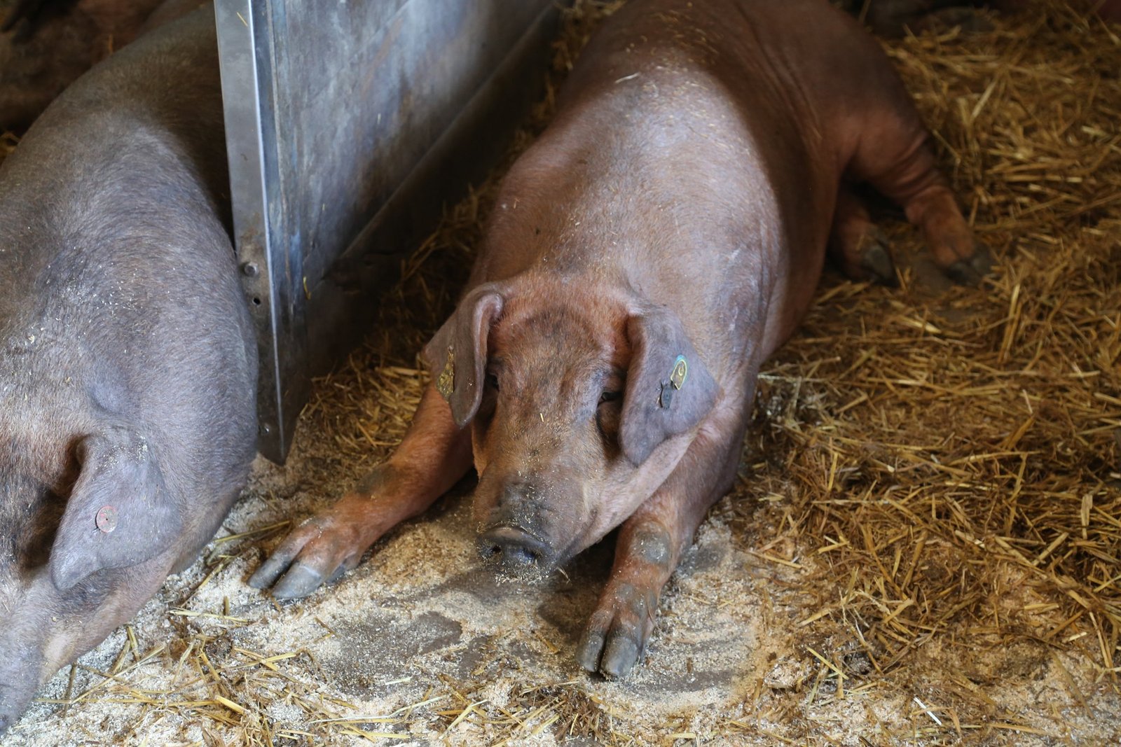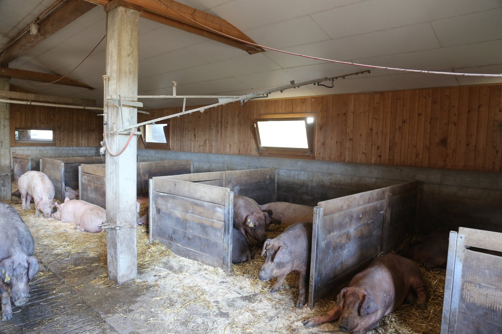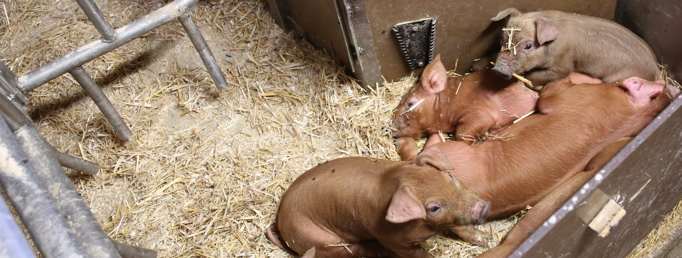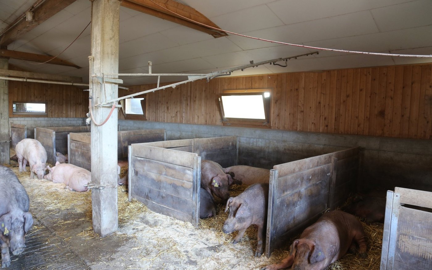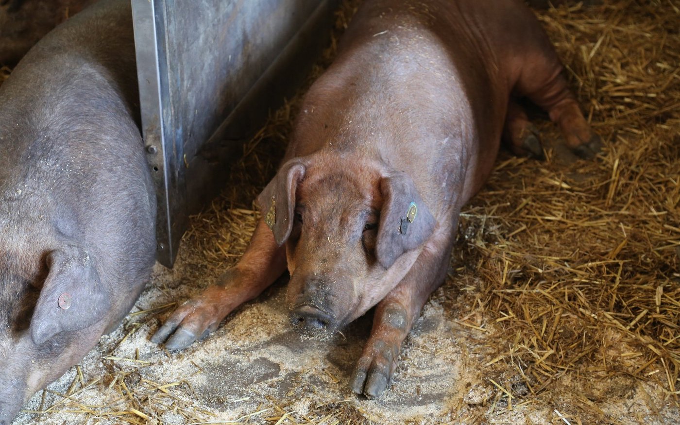 Duroc ist eine spezielle Rasse. Laut Samuel Schwab sei die Rasse eine gute Vaterlinie und habe eine sehr gute Fleischqualität, vor allem was das intramuskuläre Fett angehe. «Das ist zuständig für die Schmackhaftigkeit und Zartheit des Fleisches. Die Duroc sind bei den Schweinen das Wagyu bei den Rindern», schmunzelt er. Auch die Züchtung der Tiere ist anders. Duroc-Schweine werfen pro Wurf nur 5 bis 8 Ferkel, während weisse Sauen 12 bis 14 werfen. «Durch das brauchen wir für das Duroc-Fleisch einen Mehrpreis», sagt Schwab. Dafür sei die Rasse äusserst robust. «Wenn man ein Duroc mit einer weissen Sau kreuzt, gibt es ein Mastferkel mit einem guten Heterosis-Effekt. Das heisst die Mastferkel sind besonders gesund», fügt er an.