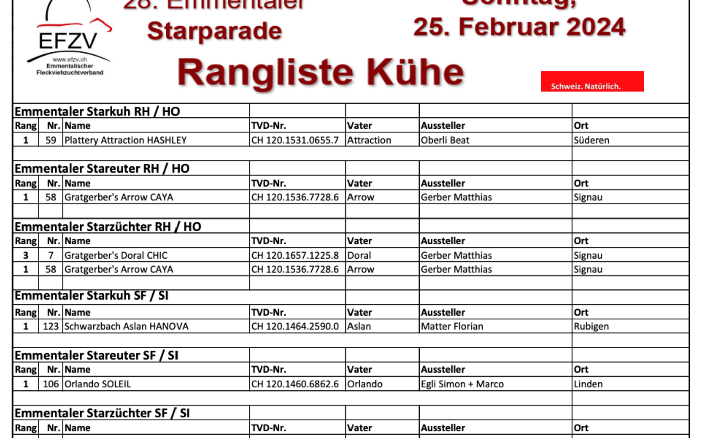 Caya zusammen mit ihrer Stallkollegin Gratgerbers Doral Chic, liessen dann auch beim Züchtercup keine Zweifel aufkommen und holten den Titel des Starzüchters der Holstein in Gratgerbers Stall. Bei den Rassen SI und SF, die Mario Nydegger richtete, ging der Starzüchtertitel an Marco und Simon Egli aus Linden, die mit den Kühen Orlando Soleil und Power Theresa die Nase in Sachen Harmonie vorne hatten. Orlando Soleil hatte sich zuvor bereits den Stareutertitel gesichert.