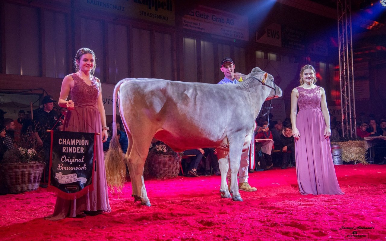 Der Schwyzer Viehzuchtverband durfte an der Junior Show 28 Brown Swiss- und 14 Original Braunvieh Erstmelkkühe ausstellen. Bei der Zuchtrichtung Brown Swiss dominierte die Phil Tochter Paris von Markus Kennel, Steinerberg. Sie wurde vom Urner Experten Daniel Gisler sowohl in der Championwahl wie auch im Schöneuterwettbewerb zur Siegerin gekürt. Im Euterwettbewerb standen mit Eichholz Gen Rocky Kelly von Fredi Diethelm, Tuggen und Schatt's Haegar Zilona von Anna-Louise Strodthoff und Armin Schatt, Feusisberg zwei Tiere aus dem äusseren Kantonsteil auf dem Podest. In der Championwahl komplettierten Büeler's BS Phil Chiquita von Roman Büeler aus Seewen und Höfli's Capucino Calanda von Roland Gwerder, Muotathal das Podest.