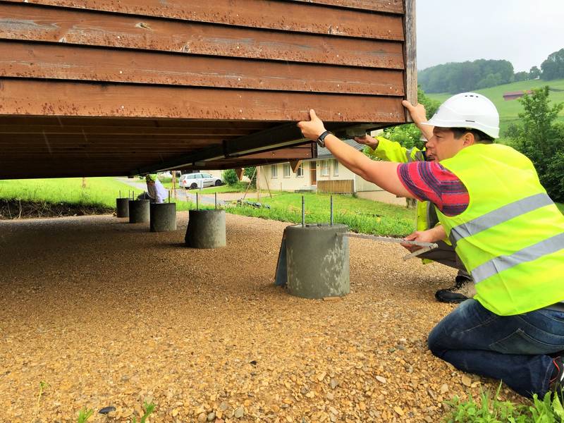 Das zwölf Tonnen schwere Gebäude wurde mittels Teleskop-Kran an seinen neuen Standort gehoben, wie das FiBL mitteilt. Der Umzug wurde nötig, weil der bisherige Platz für die 2. Bau-Etappe am FiBL mit Restaurant, Konferenz- und Bürogebäude freiwerden muss.