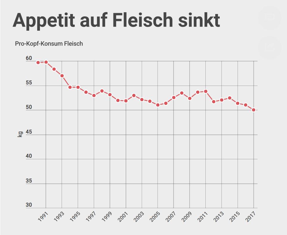 50 kg Fleisch hat jede Schweizerin und und jeder Schweizer im Jahr 2017 gegessen. Gegenüber 1990 entspricht dies einem Minus von 16 Prozent.