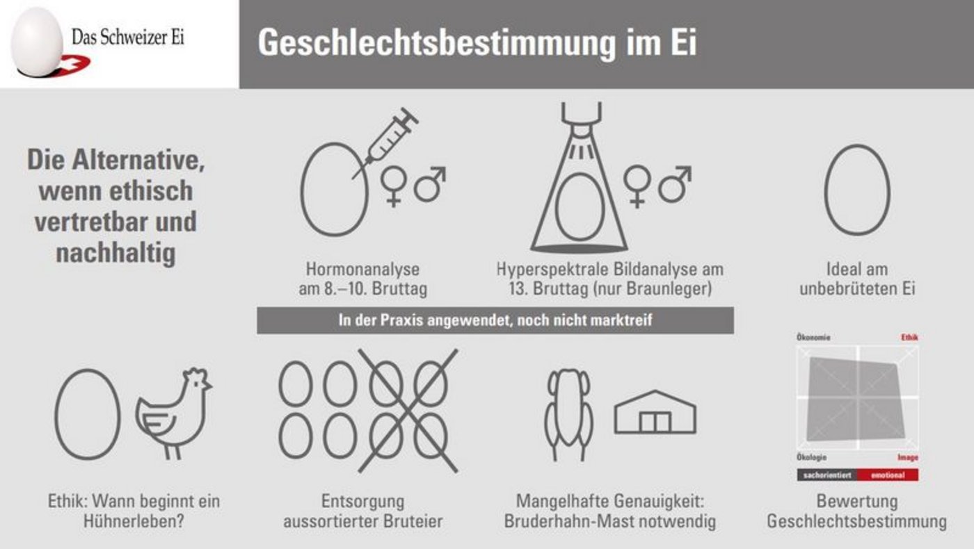 Für die Sicherstellung des Tierwohls und der hohen Produktsicherheit sollten Bruteier weiterhin von Schweizer Elterntieren stammen und die Küken müssen in der Schweiz schlüpfen, sagt Würgler. Ab diesem Herbst würden bei einem Detailhändler Eier zum Verkauf stehen, die von Legehennen stammen, welche nach dem Geschlecht aussortiert worden sind.