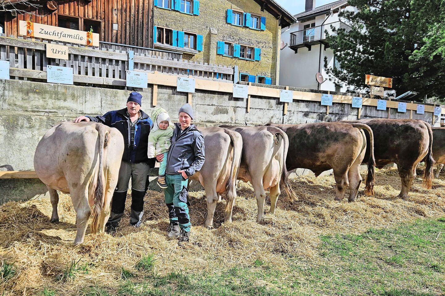 Die Familie Markus Meuli konnte heuer gleich mehrere Zuchtfamilien zeigen. Einerseits waren das die beiden weiblichen hoch punktierten Zuchtfamilien Rebroff Fortuna (83 Punkte) und Ural Ursi (87 Punkte), andererseits die Halteprämie vom Stier Luigi. Gleich mehrere Besonderheiten machten die drei Zuchtpräsentation speziell. So bestand die Zuchtfamilie Ursi gleich aus sieben Tieren, darunter drei imposante Natursprungstiere.