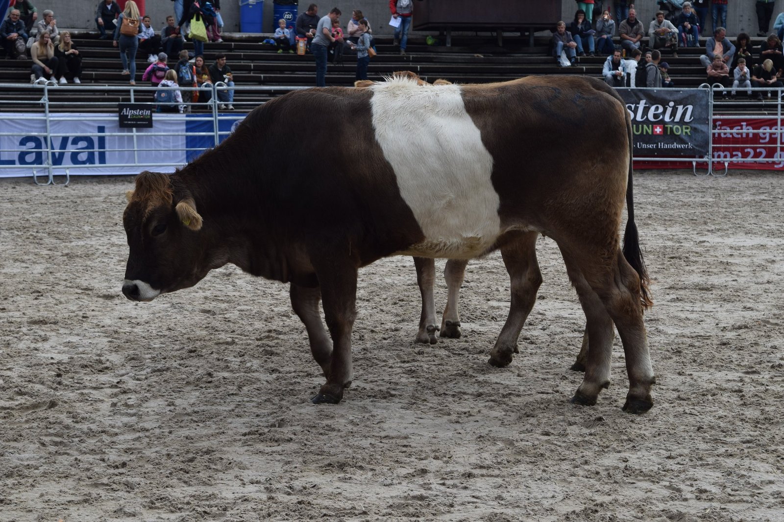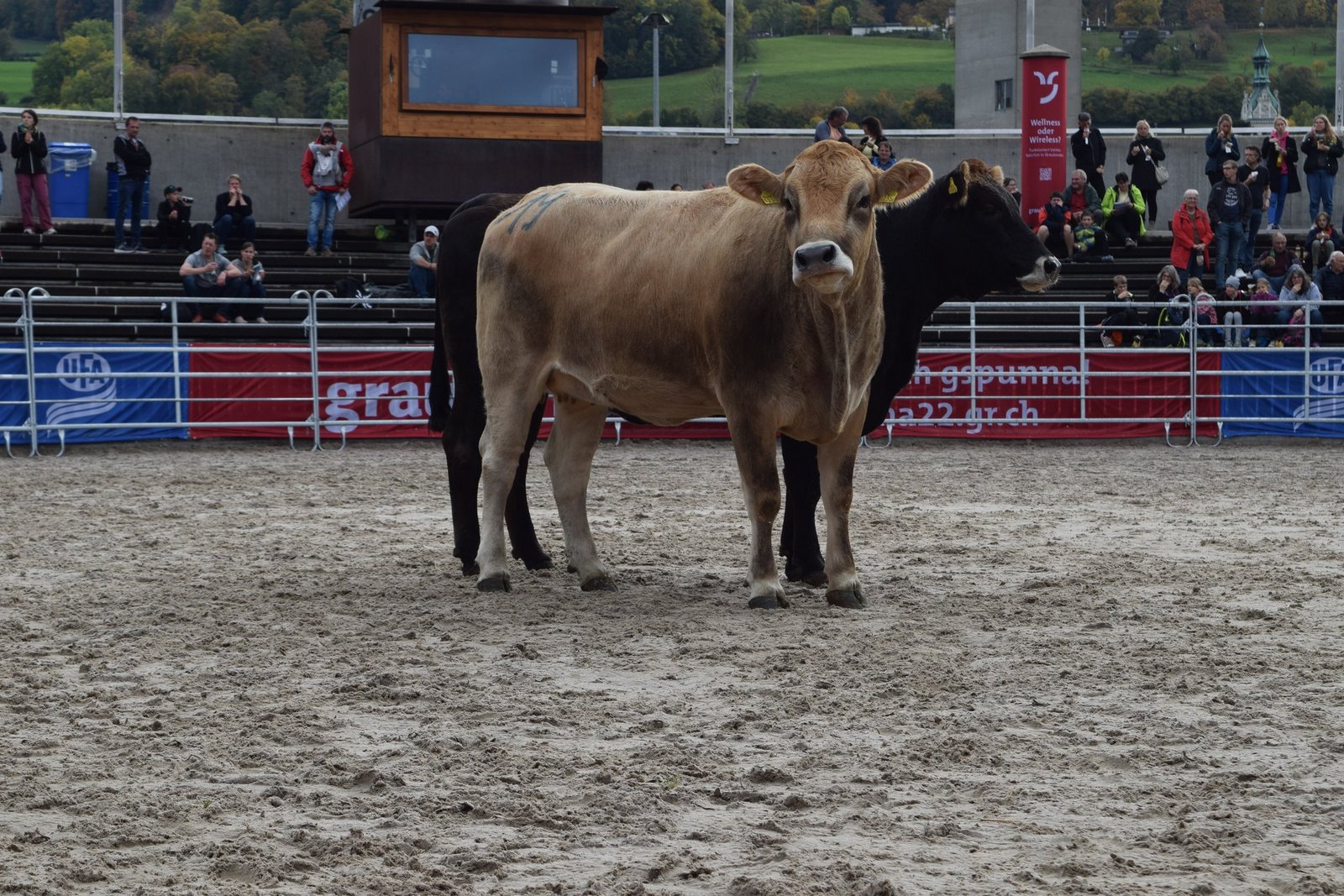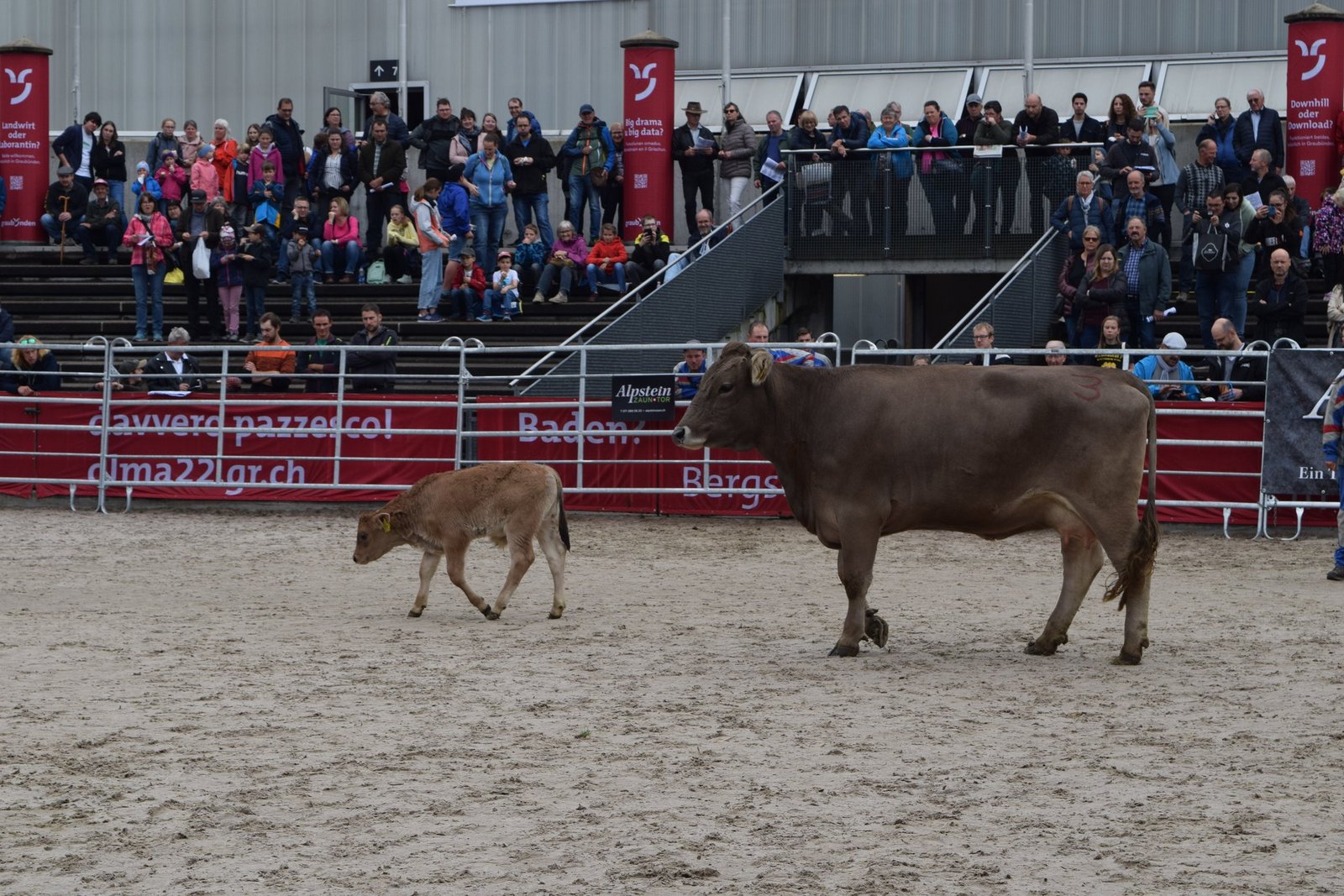 Als drittes Tier wurde OB-Kuh Azura mit ihrem Kalb in den Ring gebracht. Das Stierenkälbchen war etwas übermütig, rannte kreuz und quer durch den Ring und bahnte sich schliesslich einen Weg zwischen der Kamera und Pannels hindurch, wodurch das Stromkabel riss. «Das war’s dann mit der Live-Übertragung», kommentierte Jaquement trocken. Azura wurde nach kurzer Unterbrechung für 4'500 Franken versteigert und erzielte damit das Tageshöchstgebot. [IMG 7]
