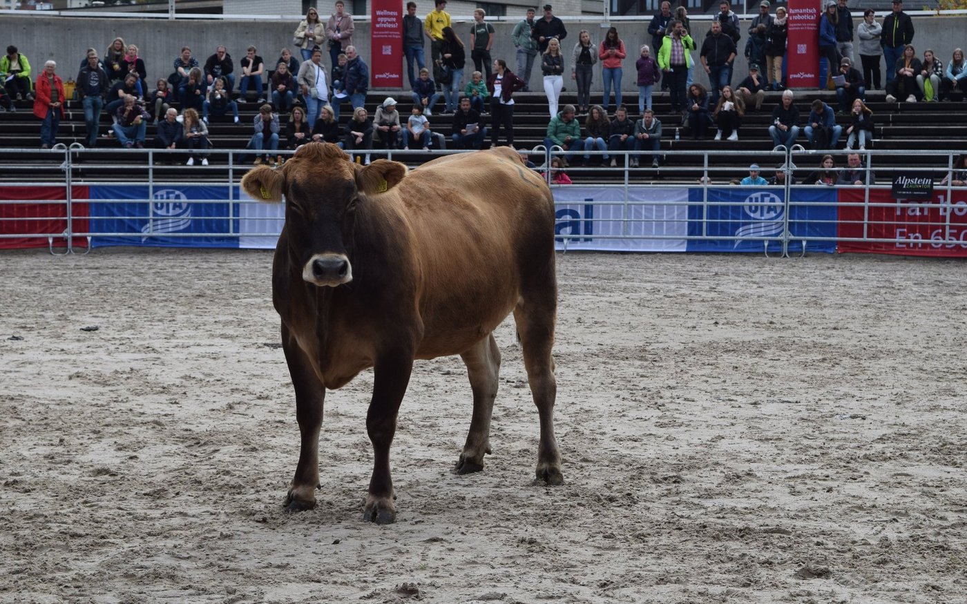 «Wir haben hier eine wunderbare Kollektion an Mutterkühen oder zukünftigen Mutterkühen», warb Auktionator Urs Jaquemet, bevor es am 14. Oktober 2022 in der Olma-Arena losging. Jaquement führte bereits zum 17. Mal durch die Olma-Fleischrinder-Auktion – so lange wie es die Auktion gibt. Erstmals überhaupt wurde die Auktion als Hybridveranstaltung durchgeführt: Interessierte Käuferinnen und Käufer konnten von zu Hause aus mitbieten. Dafür stand ein Kamerateam im Ring, das die Tiere während der Präsentation filmte.