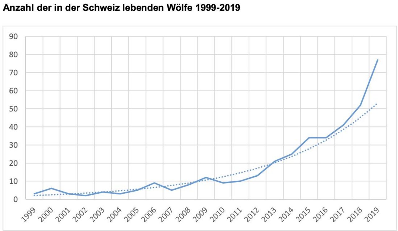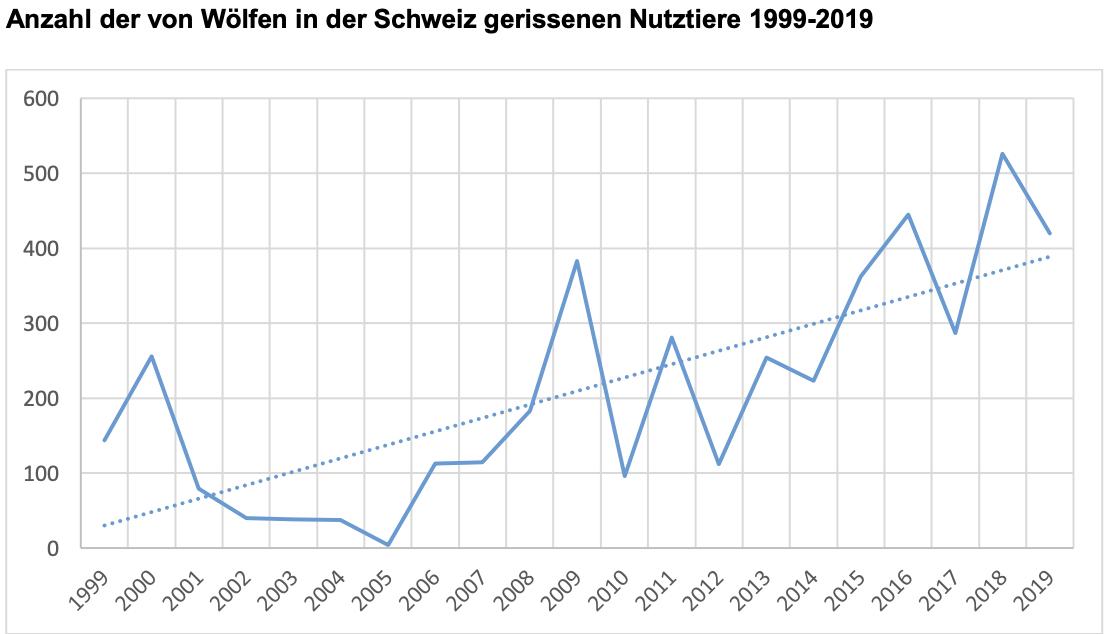 In der Anfangsphase der Rückkehr der Wölfe in die Schweiz vor etwa 25 Jahren, seien pro Wolf deutlich mehr Nutztiere gerissen worden, als dies heute der Fall ist. Das beweise die Wirksamkeit des Herdenschutzes, schlussfolgert die Gruppe Wolf Schweiz. Dass der Schutz vor Nutztieren immer schwieriger werde, sei ein falscher Eindruck.