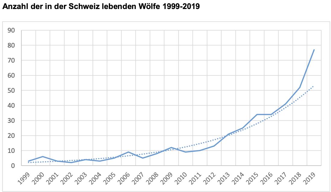 Die Zahl der Wölfe in der Schweiz wächst seit Jahren. Sobald der Lebensraum gesättigt ist, erwartet man laut Bericht ein Abflachen der Kurve und eine Stabilisierung er Bestände. (Grafik: Kora)