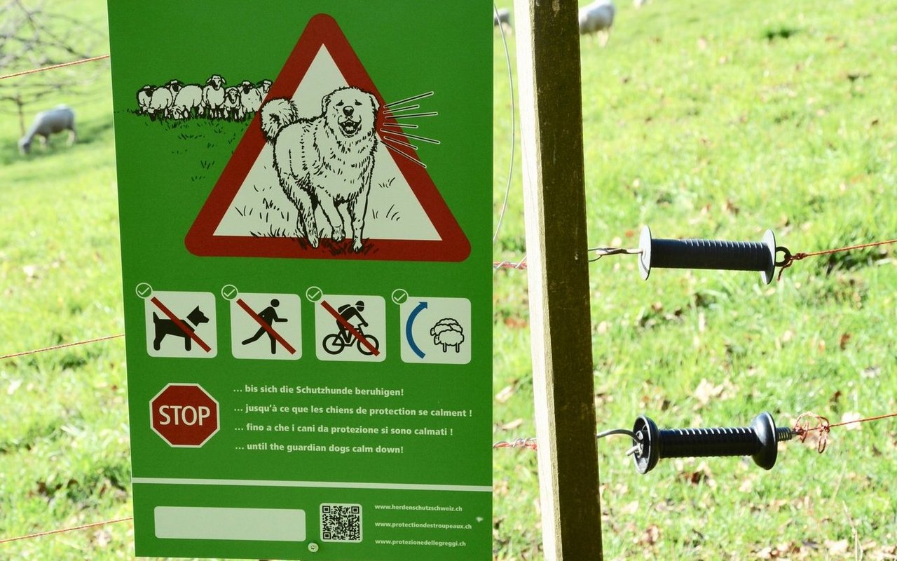 Noch bevor man hört oder sieht, dass Herdenschutzhunde auf dem Betrieb von Sabrina Otto und Bruno Zähner gehalten werden, fallen die grünen Tafeln auf. Sie sind auf dem ganzen Areal des Guggenbühls, das auf einer Anhöhe etwas ausserhalb des zürcherischen Illnaus liegt, verteilt. Auf ihnen findet man die offiziellen Warnhinweise und Verhaltenstipps vom Bundesamt für Umwelt für den Umgang mit Herdenschutzhunden. Betr…