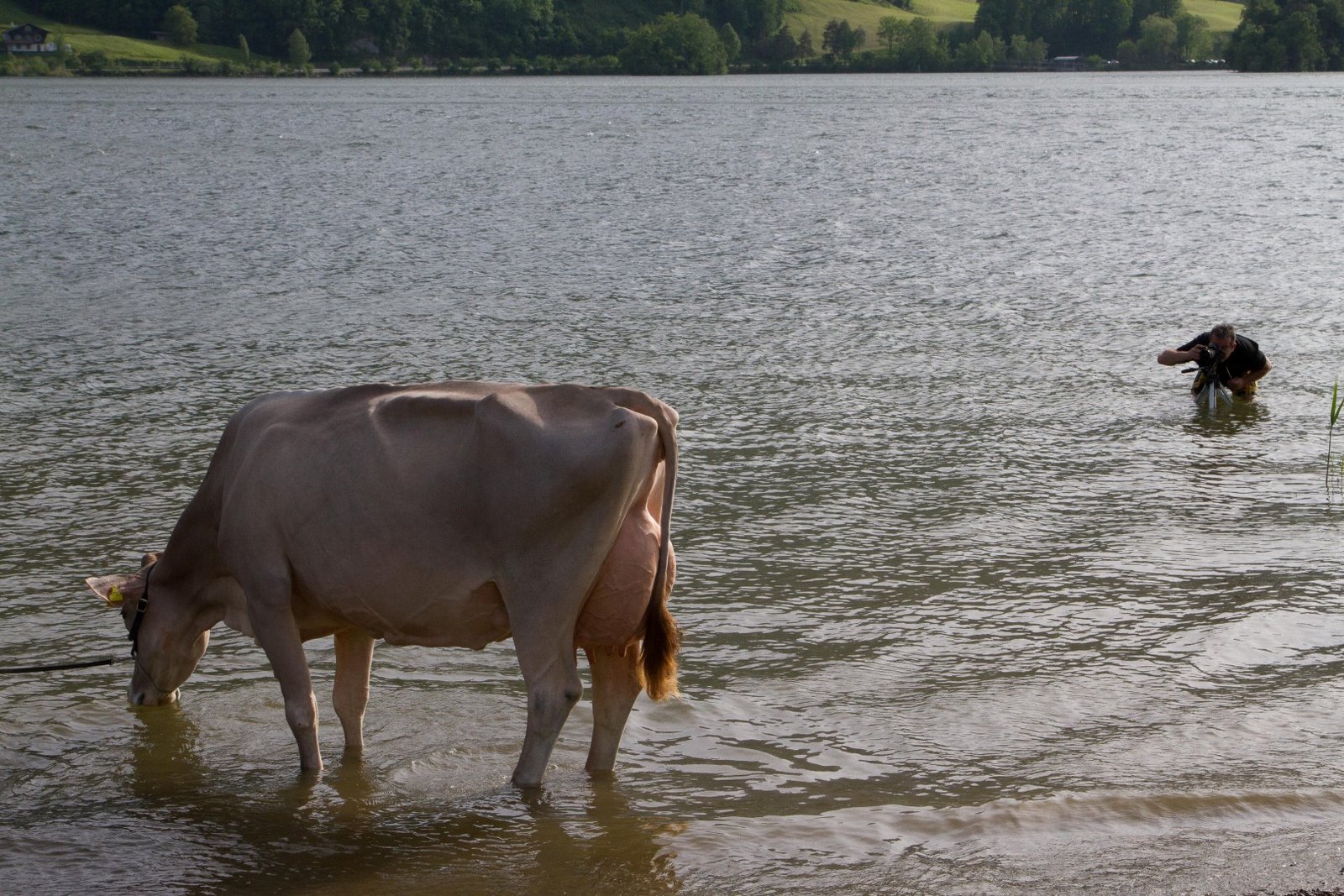 Eigentlich ging es darum, die Kuh zu fotografieren, erst bei der Hofanfahrt haben wir den kleinen Welpen gesehen, und da wusste ich, dass wir noch etwas Spezielles machen werden. Dass sich die Blicke von Kuh und Hund jedoch so trafen, war absoluter Zufall. Vorgesehen war dass die Kuh frisst und Sindy in die Kamera schaut. Der Moment dauerte höchstens zwei Sekunden.