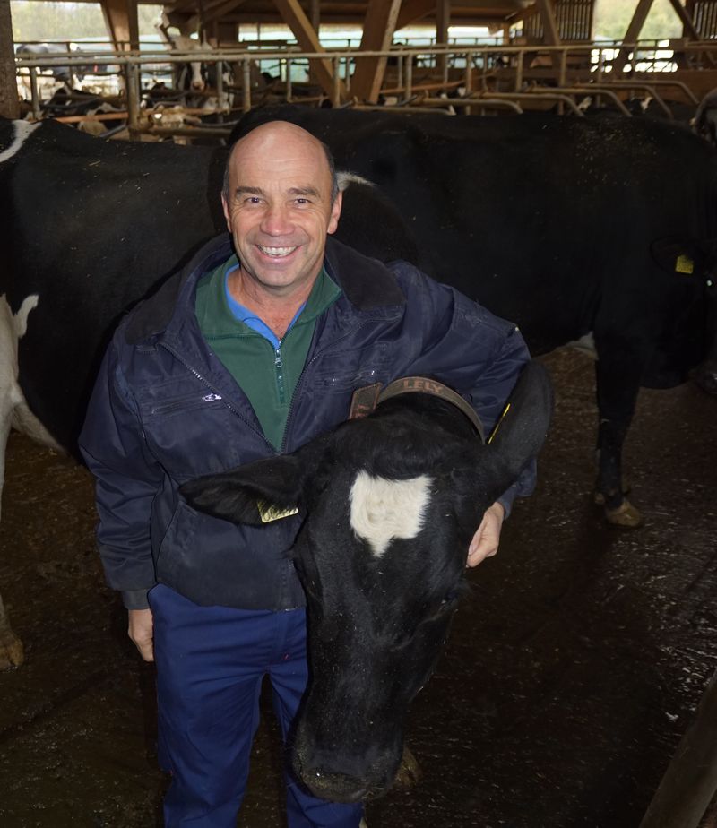 Koster kennt fast jede der etwa 170 Kühe im Stall, nicht nur von der Ohrmarke her, sondern auch vom Aussehen. Er hat ein gutes Auge für seine Tiere und nicht nur das, auch ein gutes Verhältnis zu ihnen. Sie gehen nicht davon, wenn er zu ihnen in den Stall kommt und für ein Foto lässt sich schnell eine Kuh finden, die mit dem Chef posiert.