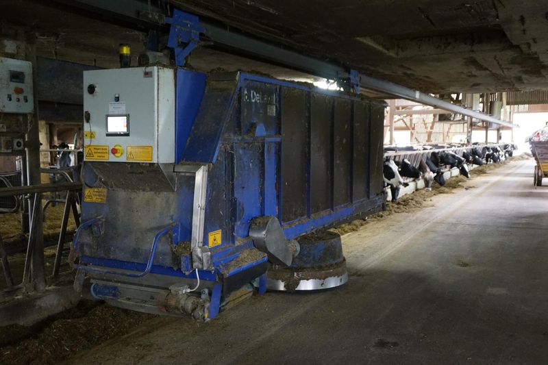 Ein Entmistungsroboter reinigt die Laufgänge, indem er die Kuhfladen mit einem Schieber in einen Kanal am Ende des Stalles schiebt und zugleich den Boden mittels einer Wasserdüse befeuchtet, damit der Kot nicht am Boden klebt. Bei seiner Fahrt durch den Stall weichen ihm die Kühe einfach aus. «Das Zusammenspiel von Natur und Technik fasziniert mich», bemerkt der Landwirt. Ein Fütterungsroboter legt den Kühen immer wieder neues Futter vor und schiebt ihnen das zu weit wegliegende wieder zu. Er ist eine grosse Hilfe für die Landwirte. Sie müssen nur noch dafür sorgen, dass immer genügend Futter in den Vorratsbehältern vorhanden ist.