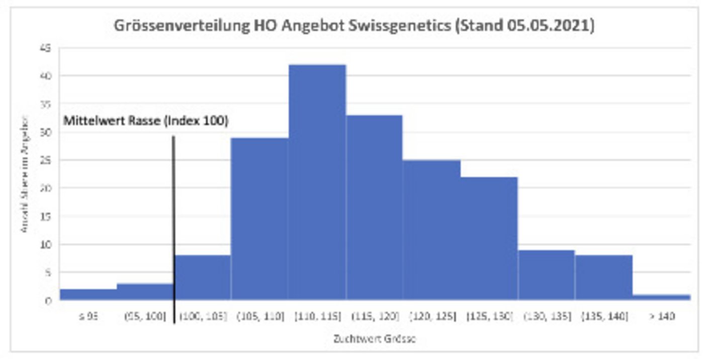 Das aktuelle Stierenangebot auf der Website von Swissgenetics (Stand 05.05.2021) zeige, dass nur fünf Stiere (oder 3%) mit einem Zuchtwert unter 100 für die Grösse angeboten werden, schreibt die IG weiter. 83% der Stiere wiesen einen Zuchtwert von mindestens 110 in der Grösse auf. «Nimmt man das Zuchtziel von HO und RH mit einer Grösse von 150 – 155cm für eine ausgewachsene Kuh, so erreichen dies Jungkühe mit einem ZW von 100 gerade (+3 - 5 cm bis ausgewachsen)», heisst es weiter.