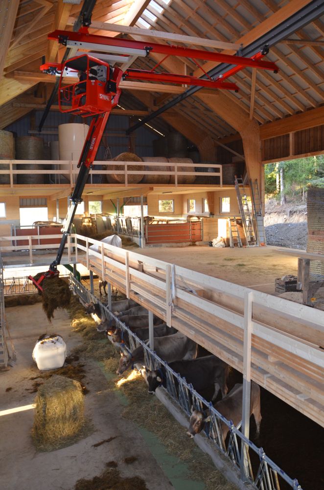 Nun, da der Stall in Betrieb ist, zeigen sich Vater und Sohn Siegrist zufrieden mit der Umsetzung. Die Tiere sind im unteren Stallteil in U-Form um die Futterachse angeordnet: Auf der rechten Achse fressen die melkenden Kühe, auf der linken Achse die Kälber und jüngeren Rinder, und auf der kurzen Seite oben die Galtkühe. Der ganze Futterbereich und das gesamte Gebäude kann mit der Greiferanlage bewirtschaftet werden. «Die Arbeitswege für die Fütterung sind kurz, weil alle Tiere an der gleichen Achse gefüttert werden können», zieht Sohn Patrik Bilanz.