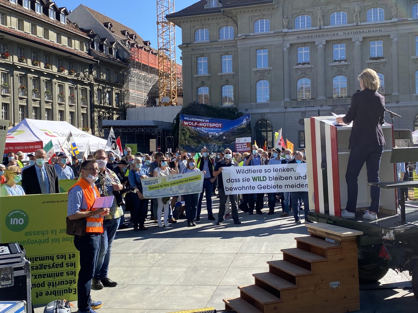 - Regula Schmid-Blumer, Bergbäuerin aus dem Kanton Graubünden: Als direkt Betroffene sprach die Bio-Landwirtin zur versammelten Menge. Ihre Heimat liege mitten im Revier des Beverin-Rudels und sie wisse, wovon sie spreche, sagte sie mit Nachdruck. Es sei ein belastendes Gefühl, zu wissen, dass der Wolf jederzeit in der Nähe des eigenen Heims und der Herde sei. Sobald man seine Tiere auf die Alp schicke, müsse man sich ständig begründete Sorgen um deren Leben machen, was für viele Bergbauern fast nicht zu ertragen sei. Schmid-Blumer betonte, dass der Herdenschutz im Gebirge teilweise nur schlecht oder gar nicht bewerkstelligt werden könne. Diese Situation führe letzten Endes dazu, dass Alpen nicht mehr bestossen würden. Als Folge prognostizierte sie einen Verlust an hochwertigen Nahrungsmitteln, Massentierhaltung und eine Zunahme der Importe.