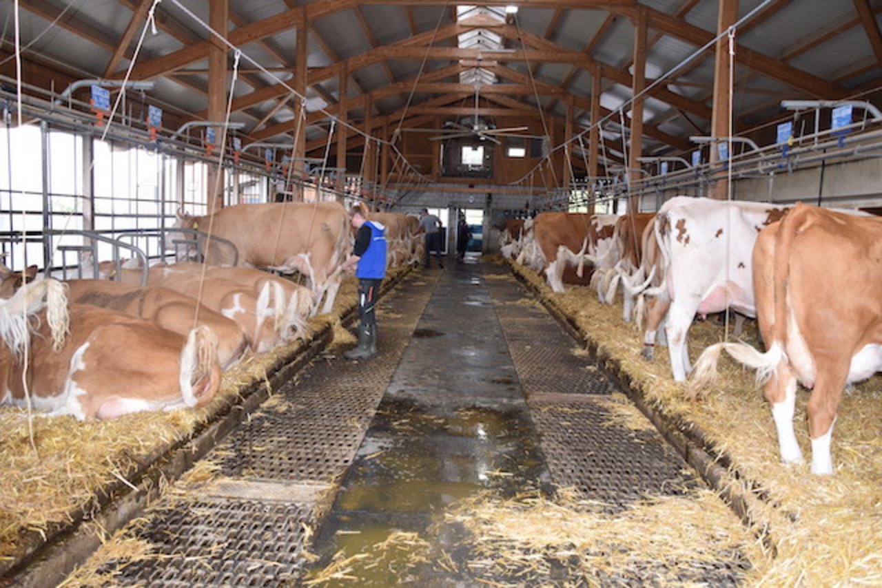 Demzufolge sei der Zucht- und Nutztierverkauf ein wichtiger Betriebszweig für sie. «Neben einer guten Milchleistung sind vor allem robuste Kühe mit einem hohen Gehalt, tiefen Zellzahlen und einer guten Melkbarkeit im Handel gefragt». Nun wird es Zeit, die Kühe wollen in den Stall, geduldig warten sie vor dem Eingang. In gemächlichen Schritten geht es los. Aus der Stereoanlage tönt im Hintergrund das Jodlerchörli Zulgtal, während Daniel und Adelheid Graf mit der Tochter Daria die Kühe im Stall in Empfang nehmen. Fast jede Kuh kennt ihren Platz, keine Hektik ist dabei zu sehen. Die Kühe fühlen sich sichtlich wohl im Anbindestall. Kaum angebunden, legen sie sich schon auf das dicke Strohbett nieder, notabene noch vor dem Melkvorgang. 2012 konnte die Betriebsleiterfamilie in den neuen Anbindestall mit 48 Kuhplätzen einziehen. Auf den zwei Lägern stehen die Kühe nicht wie üblich Kopf an Kopf, sondern Schwanz an Schwanz gegenüber.